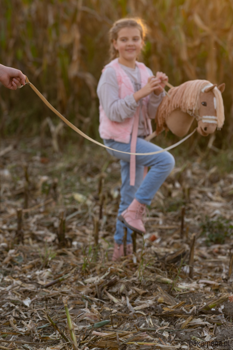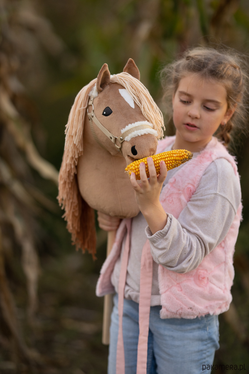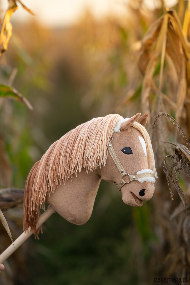 Prezentowany tutaj konik sprzedawany jest w komplecie z kantarem z taśmy nośnej z futerkiem i wodzami w kolorze beżowym