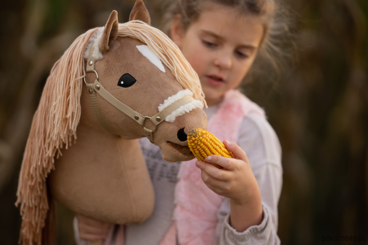 Tkanina, której uszyty jest konik to świetnie imitujący sierść minky. Grzywa wykonana jest z cieniowanej włóczki. Wypełniony kulką silikonową i umieszczony na patyku. Po rozpakowaniu, konik gotowy jest do użycia.