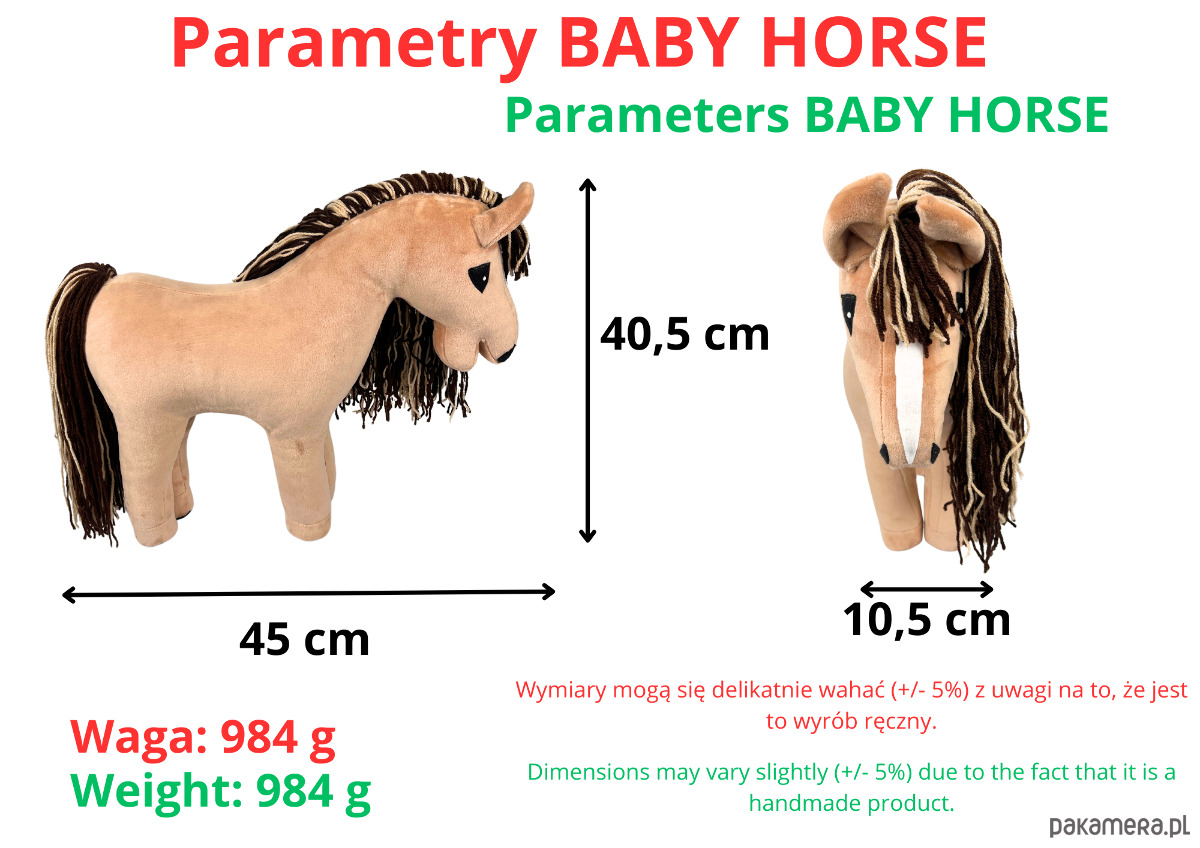 BABY HORSE STANDARD to urocza miękka zabawka, stworzona z myślą o miłośnikach koni i hobby horsów. Dzięki starannie opracowanej technologii i ręcznej pracy naszego zespołu, każdy egzemplarz wyróżnia się wyjątkowym designem oraz precyzją wykonania. Realistyczne detale, takie jak kształt uszu czy proporcje głowy, sprawiają, że maskotka wygląda niezwykle naturalnie i zachwyca zarówno dzieci, jak i dorosłych.