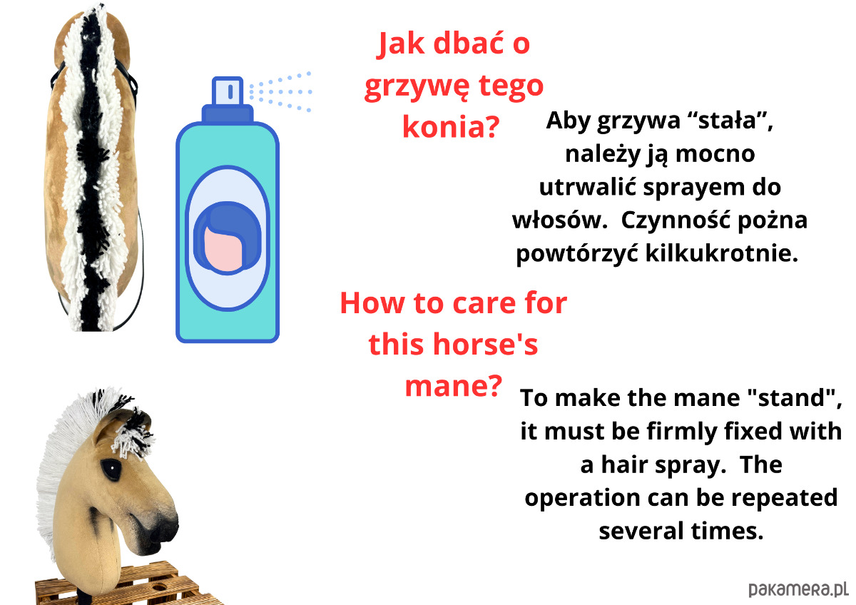 *Grzywa: Grzywa wykonana z włóczki akrylowej, nadająca realistyczny i estetyczny wygląd. Można ją zaplatać i stylizować, tworząc różne fryzury. Należy jednak unikać mocnego ciągnięcia – pamiętaj, nasze produkty to rękodzieło!