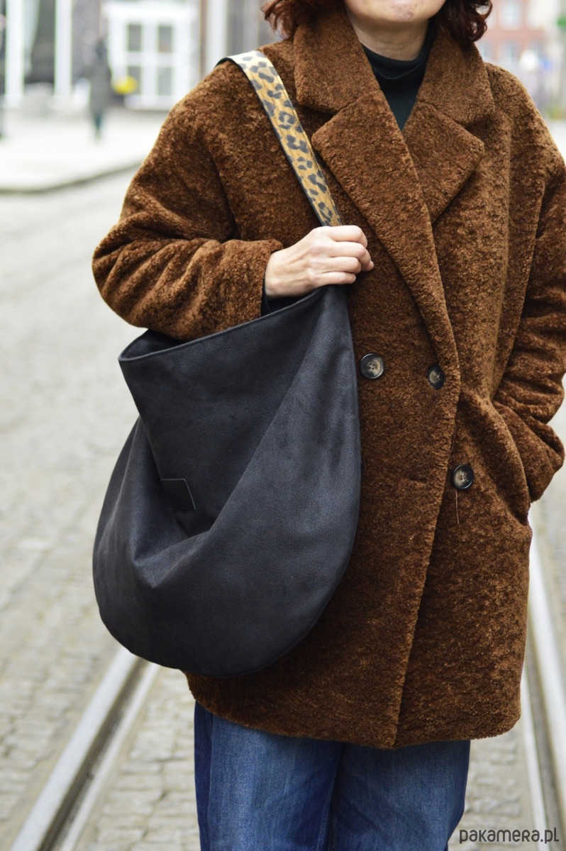 Duża, pojemna i wygodna torba została wykonana z tkaniny tapicerskiej o fakturze nubuka i skóry naturalnej ( pasek z wzorem panterki). Całość została wzmocniona warstwą wodoodporną i zapina się na suwak. Wewnątrz znajdują się trzy kieszonki.