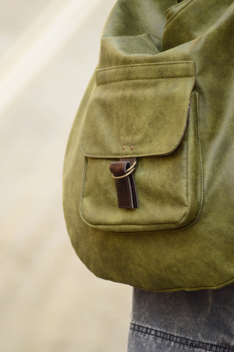 Duża, pojemna i wygodna torba wykonana z tkaniny o fakturze nubuku oraz skóry naturalnej ( pasek ,łączenia ). Wewnątrz znajdują się trzy kieszonki, całość zapina się na zamek. Wymiar: ok.50x60cm