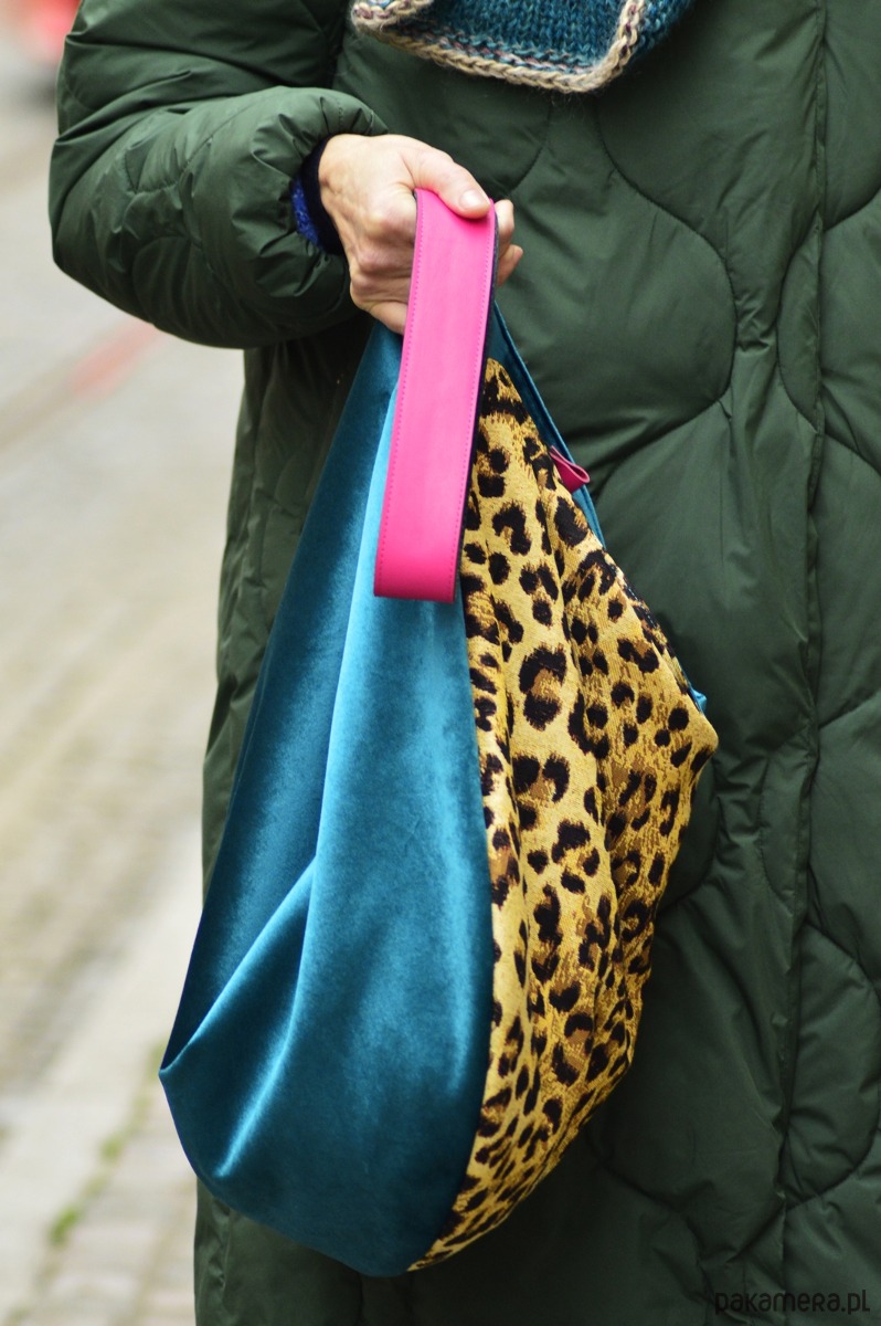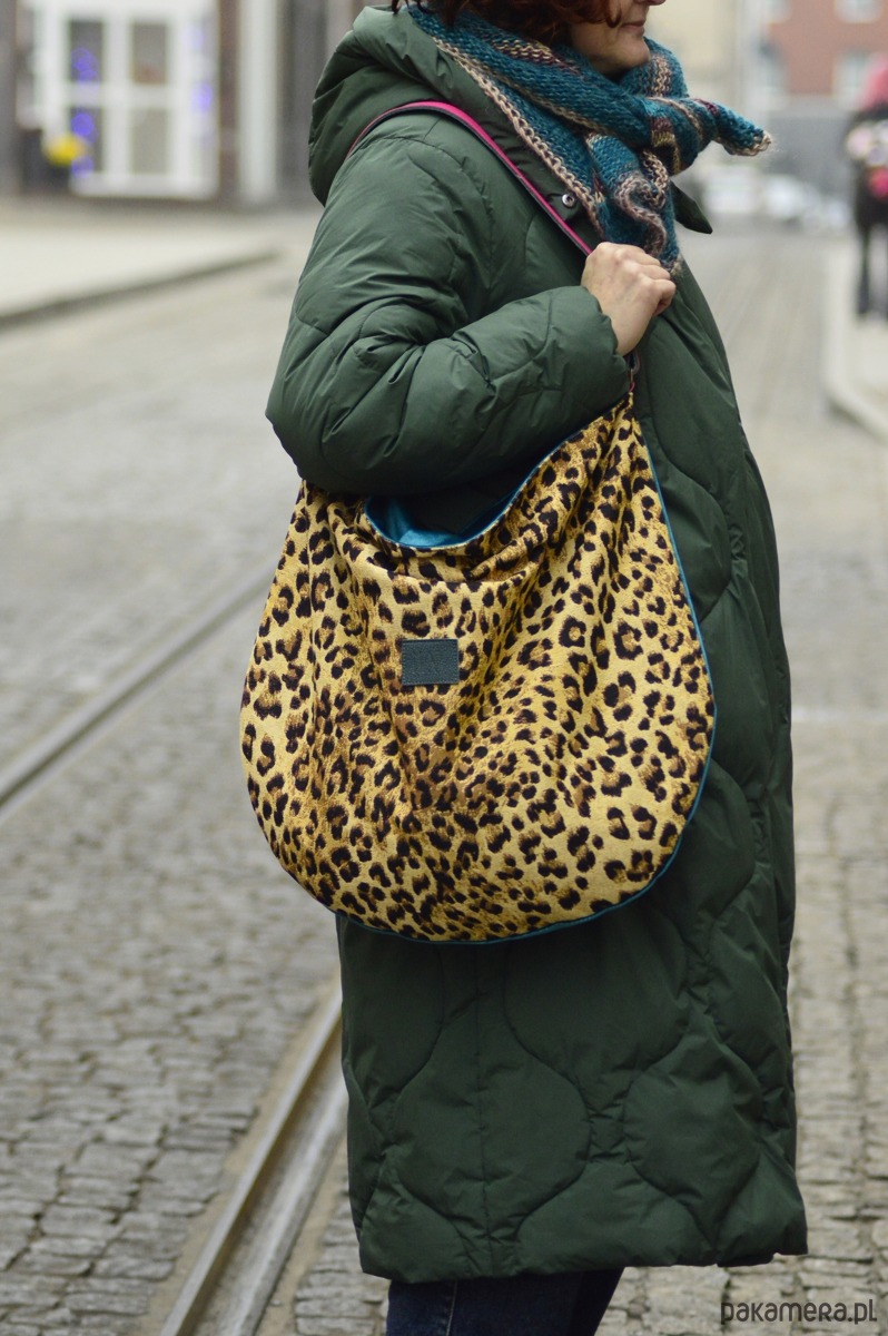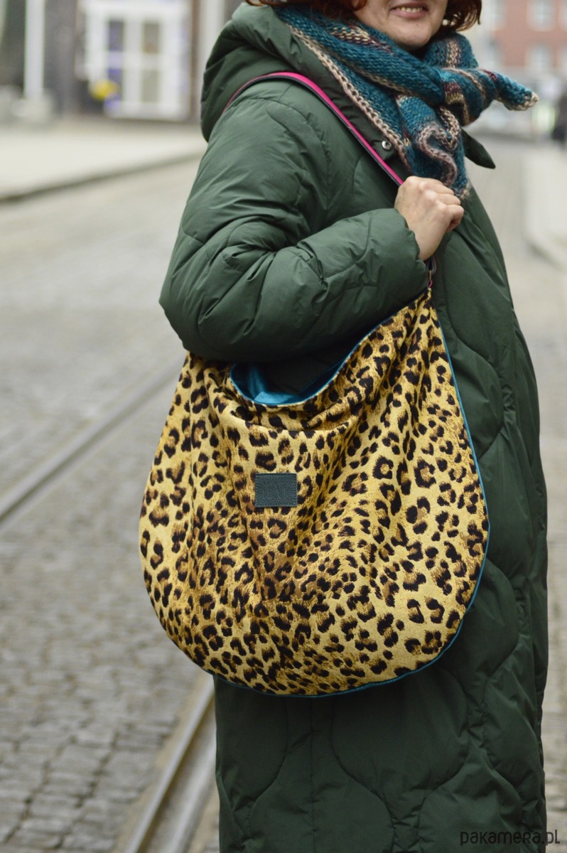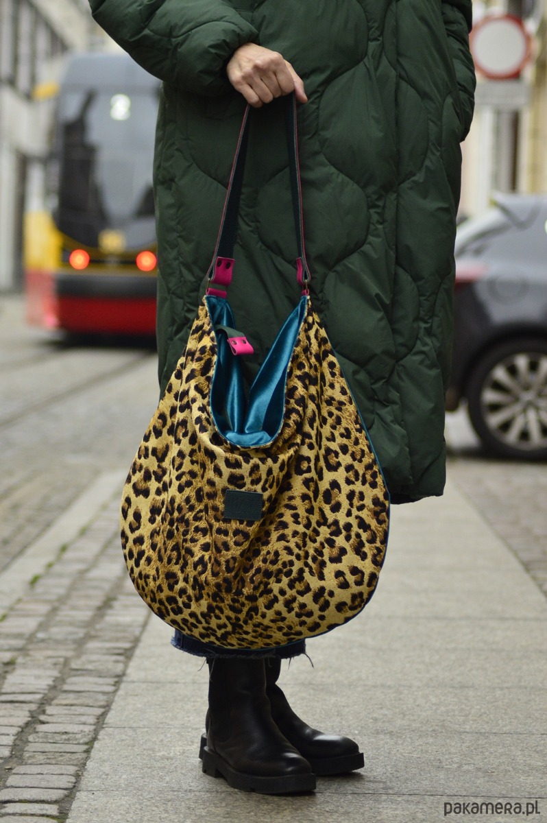Duża, pojemna i wygodna torba została wykonana z tkaniny tapicerskiej o fakturze weluru, panterkowego gobelinu i skóry naturalnej ( różowy pasek). Całość została wzmocniona warstwą wodoodporną i zapina się na suwak. Wewnątrz znajdują się trzy kieszonki.