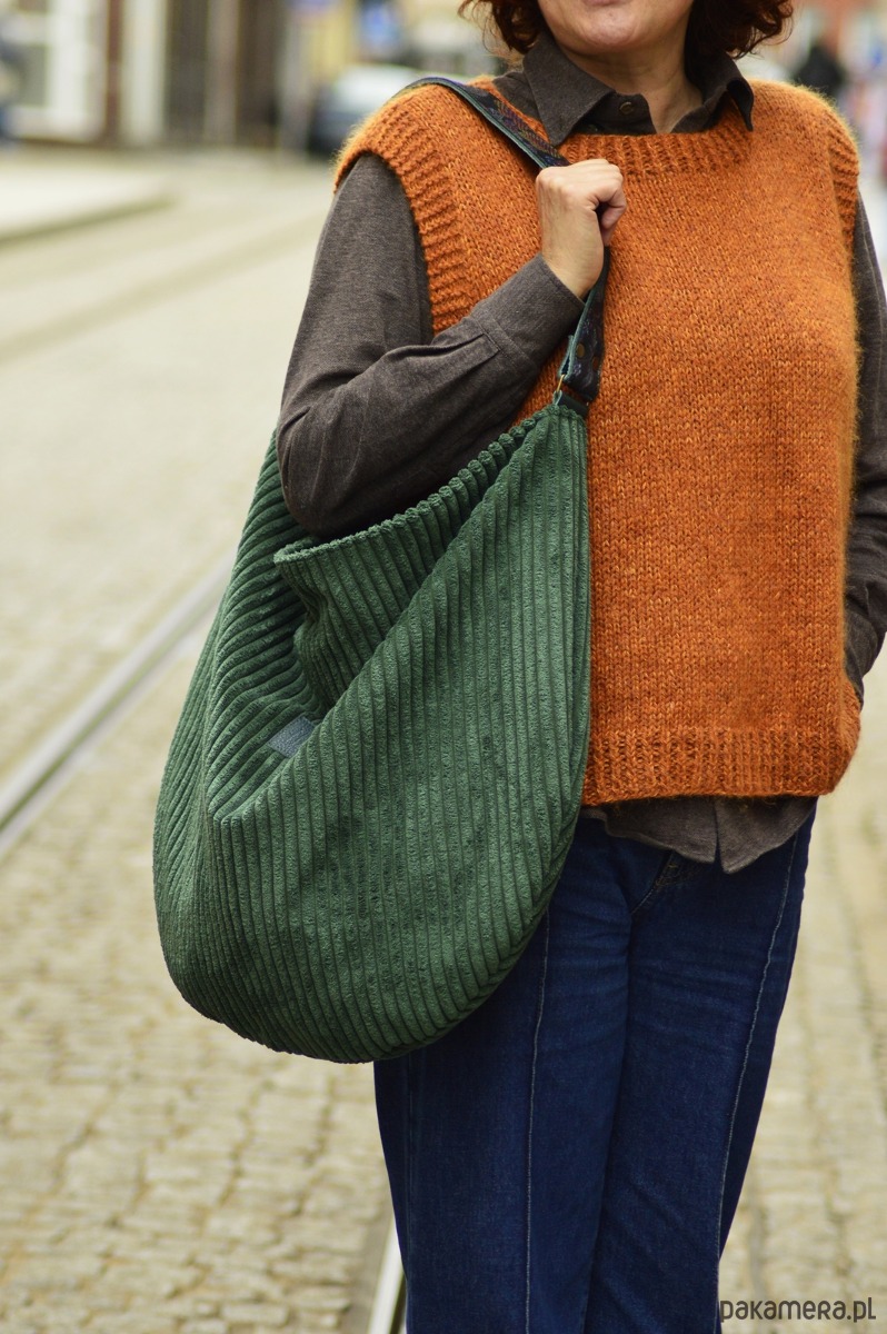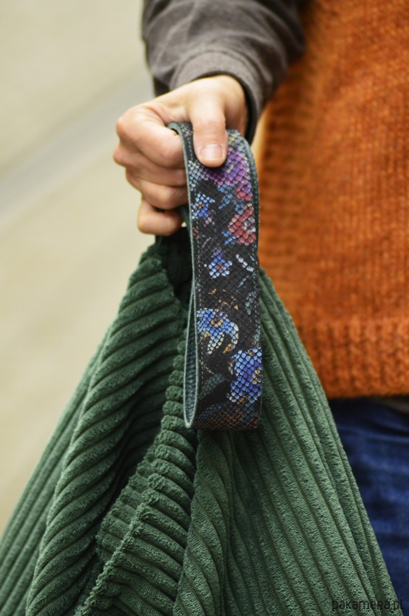 Duża, pojemna i wygodna torba została wykonana z tkaniny tapicerskiej o fakturze sztruksu i skóry naturalnej ( pasek z wzorem kwiatów). Całość została wzmocniona warstwą wodoodporną i zapina się na suwak. Wewnątrz znajdują się trzy kieszonki.