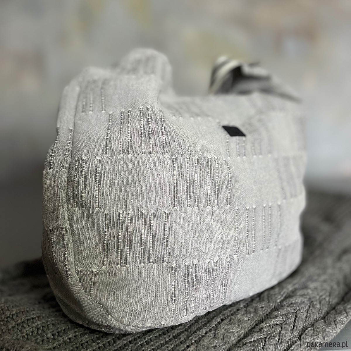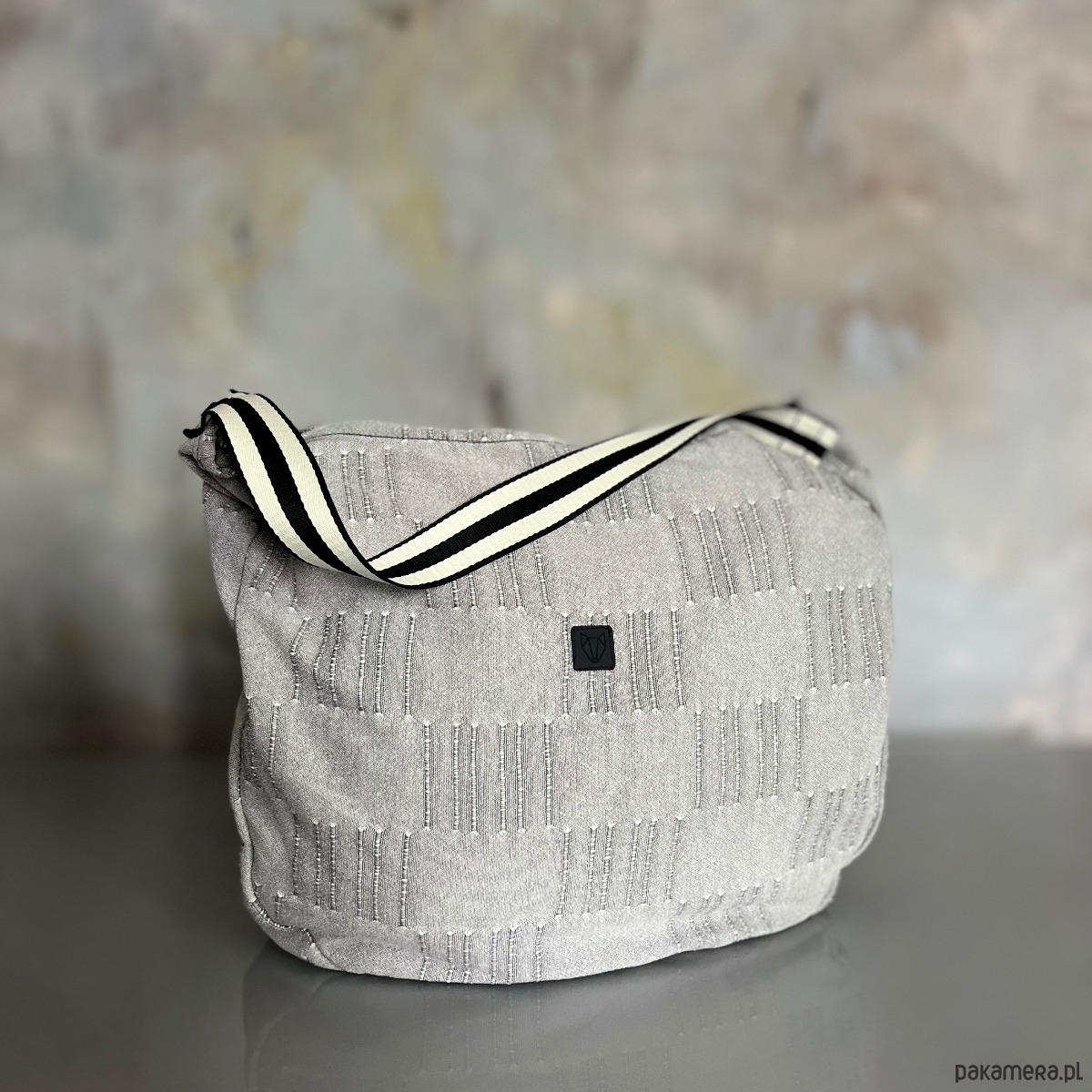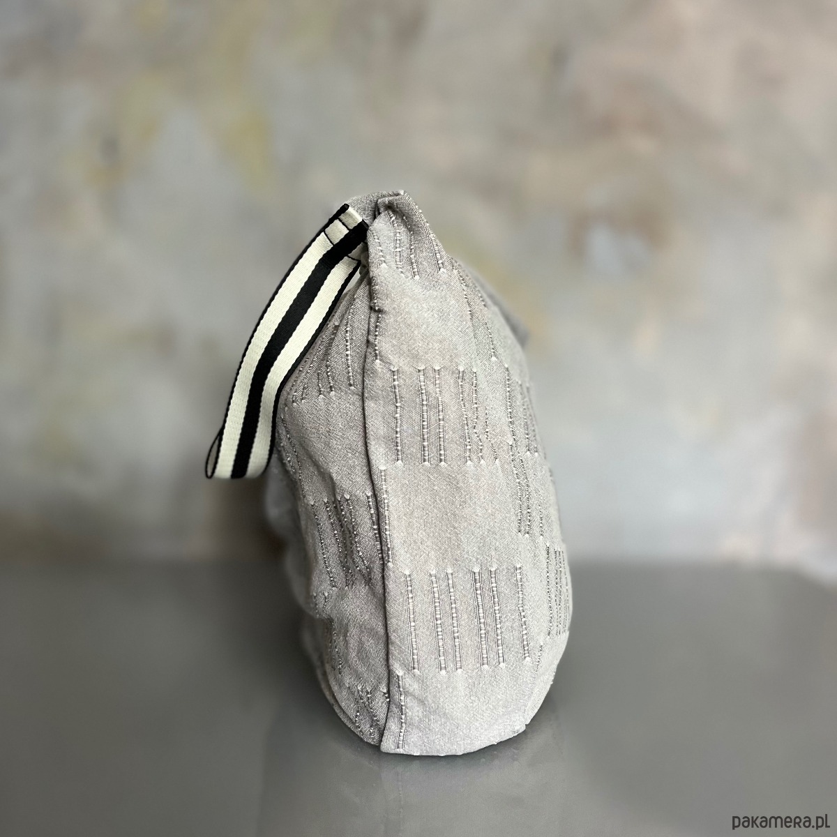 Wykonana z materiału z odzysku. Materiał pochodzi z vintage narzuty w odcieniach szarości. Pasek wykonany z taśmy nośnej w kolorze czarno białym. W środku kieszeń zapinana na zamek.