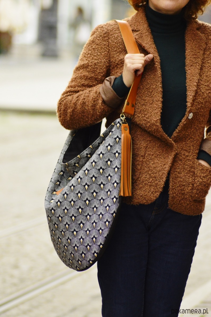 Duża, pojemna i wygodna torba została wykonana z pięknej, gobelinowej tkaniny z motywem pawich oczek, syntetycznego nubuku ( gładki, czarny tył) oraz skóry naturalnej ( pasek ,łączenia, chwost ). Wewnątrz znajdują się trzy kieszonki, całość zapina się na zamek. Torba została dodatkowo wzmocniona warstwą wodoodporną.
