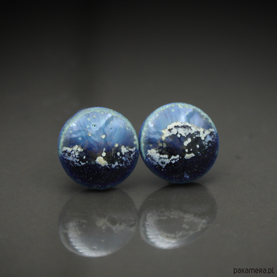 Ceramiczne, lekko nieregularne kolczyki w formie sztyftów, ręcznie wykonane z delikatnej błękitnej porcelany, jednostronnie szkliwione efektownym błękitnym błyszczącym szkliwem z efektem plamek, na antyalergicznych sztyftach ze stali chirurgicznej w kolorze srebrnym.Średnica ok. 11mm. Polecam