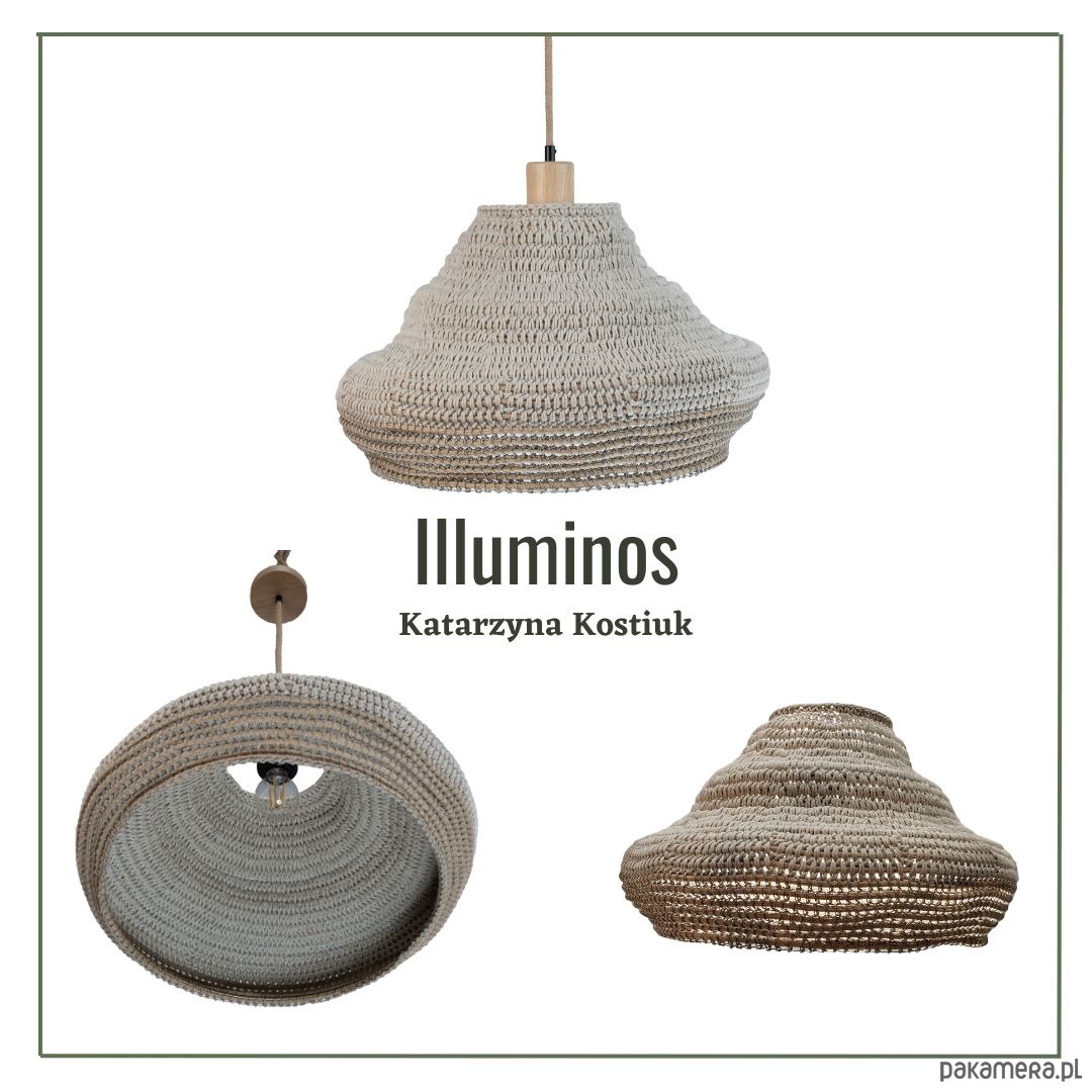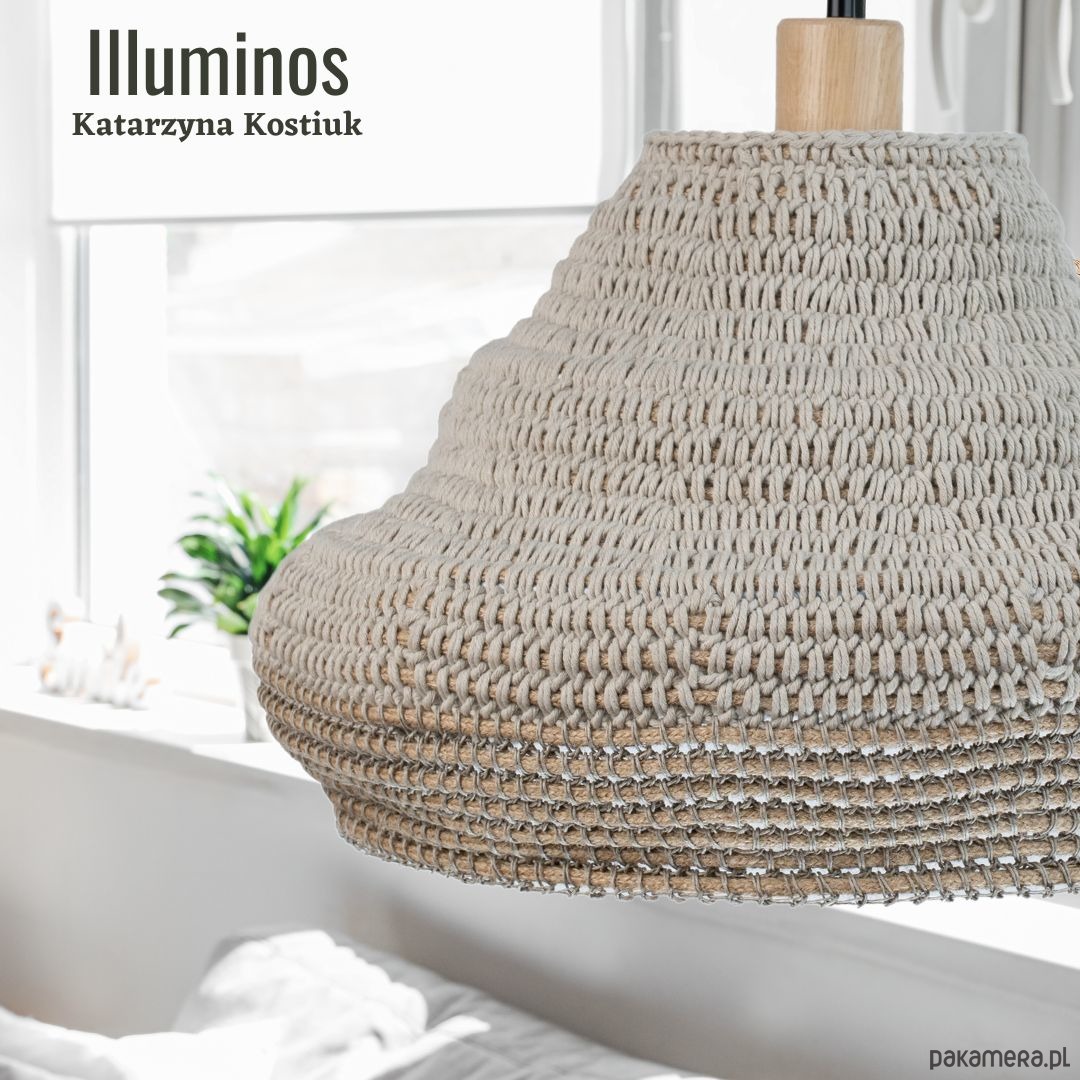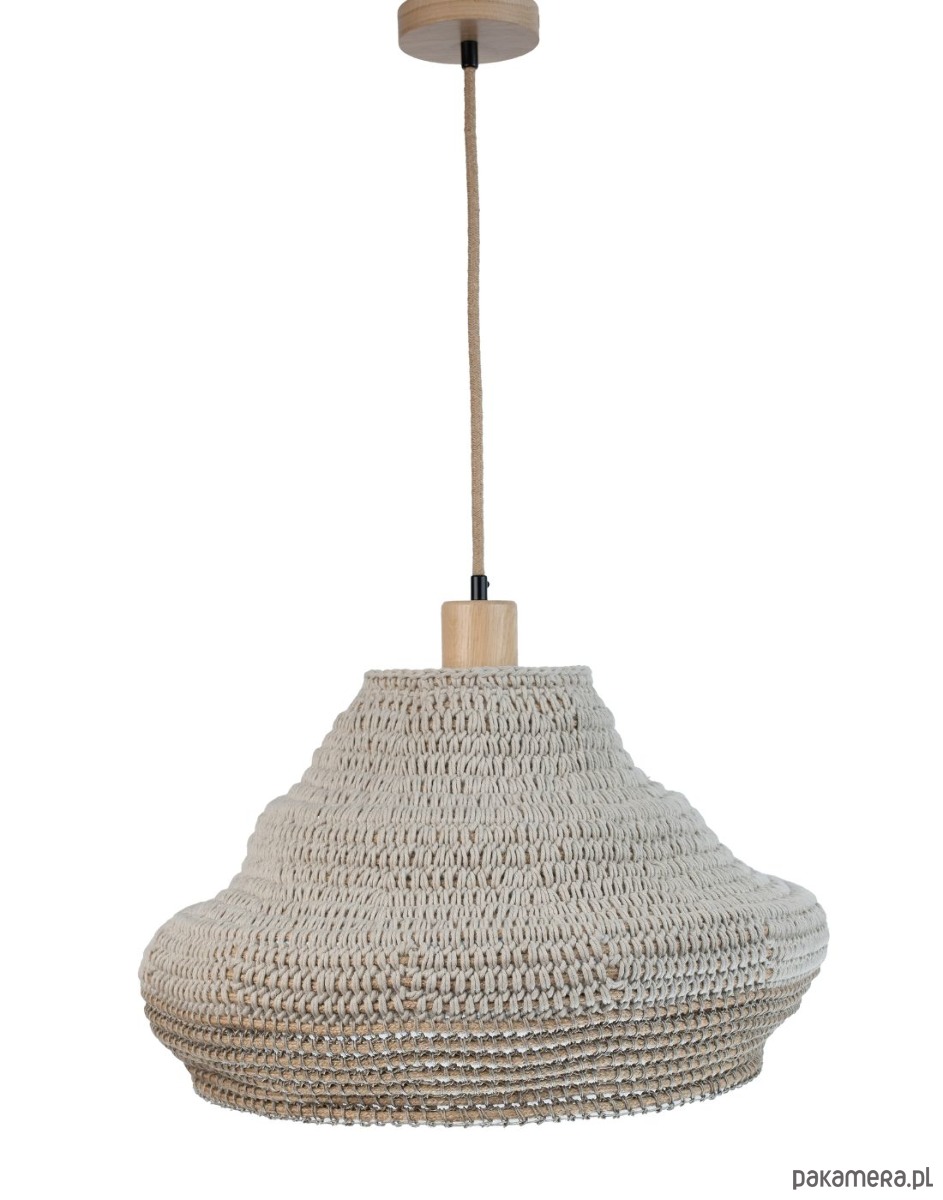Lampa wykonana ze sznurka bawełnianego i jutowego, oprawka i podsufitka z drewna dębowego, a kabel jest w oplocie jutowym.