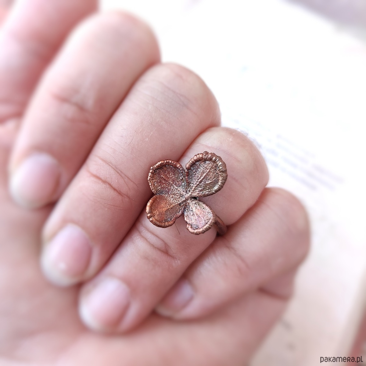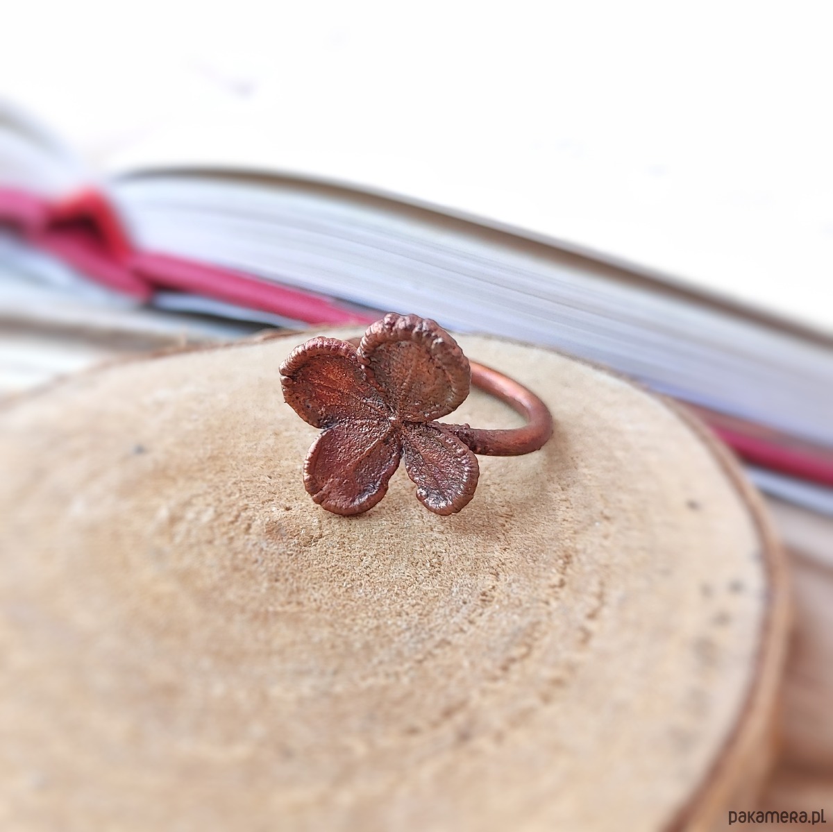 Pierścionek został z pasją wykonany z miedzi oraz prawdziwego kwiatu hortensji techniką elektroformowania miedzi.