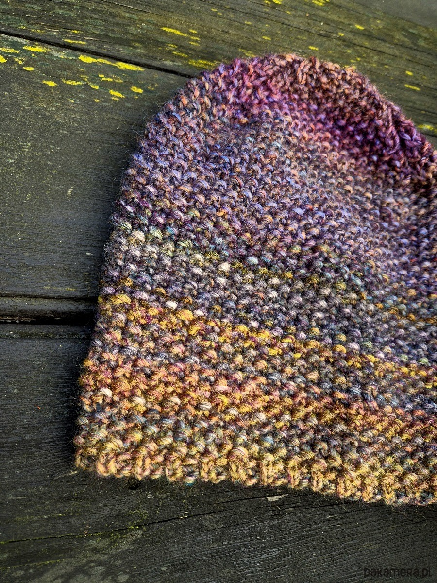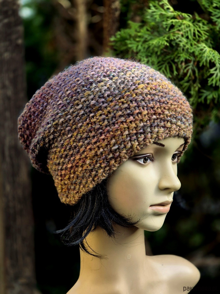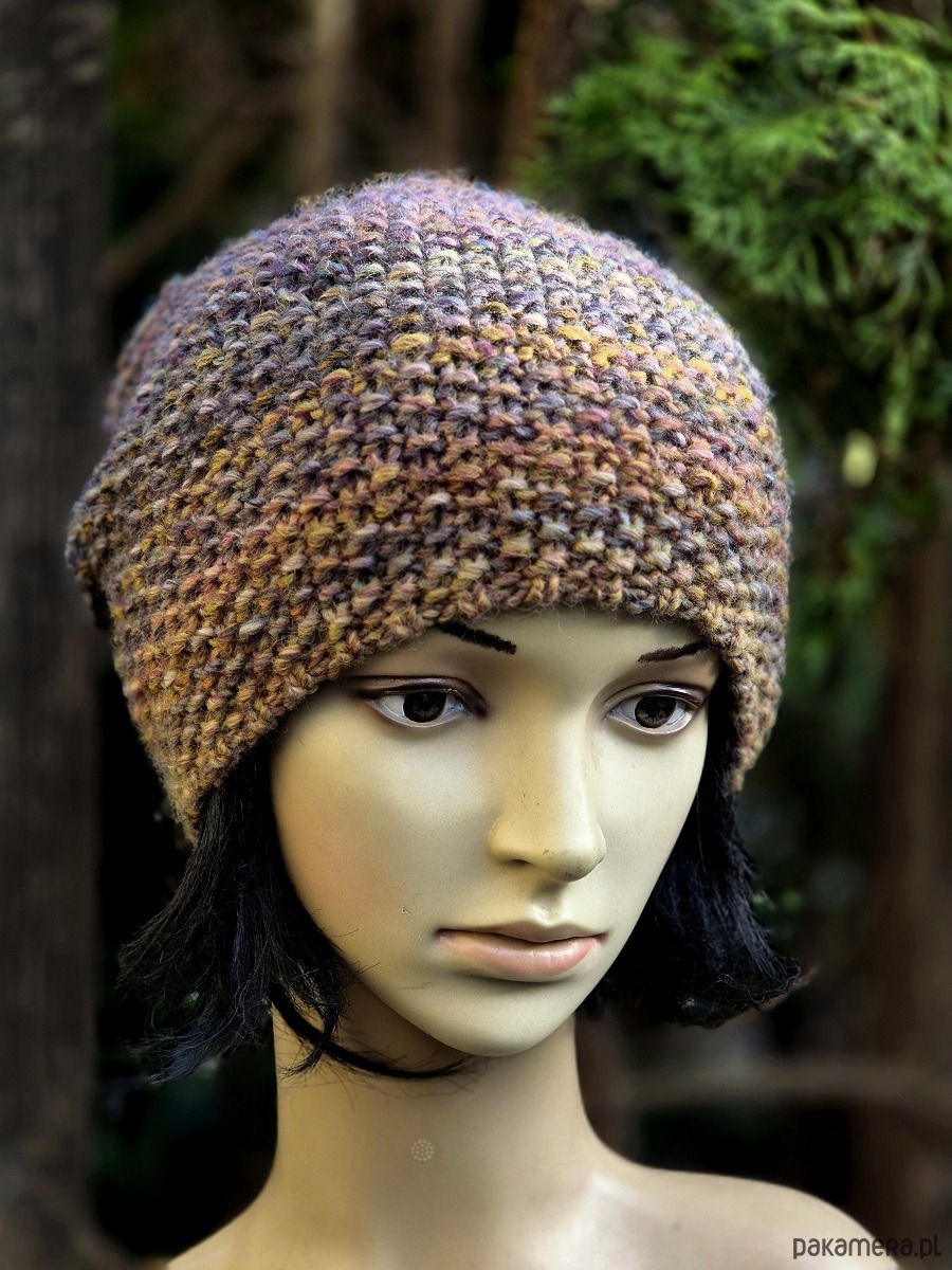 Ciepła i miękka czapa wykonana ręcznie na drutach z hiszpańskich włóczek w pięknym zestawieniu kolorystycznym (53% wełna, 47% akryl), przyjemna w dotyku. Czapka jest bezszwowa.