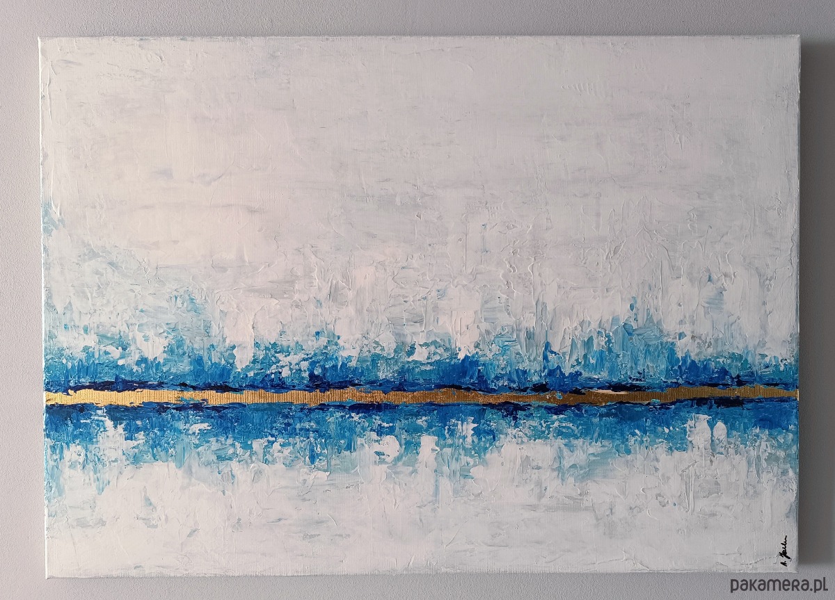 „Horyzont” to nowoczesna abstrakcja inspirowana linią morza i spokojem bezkresnej przestrzeni. Biel przechodzi w warstwowe odcienie błękitu i głębokiego granatu, tworząc kompozycję przywołującą ciszę i świeżość nadmorskiego krajobrazu.