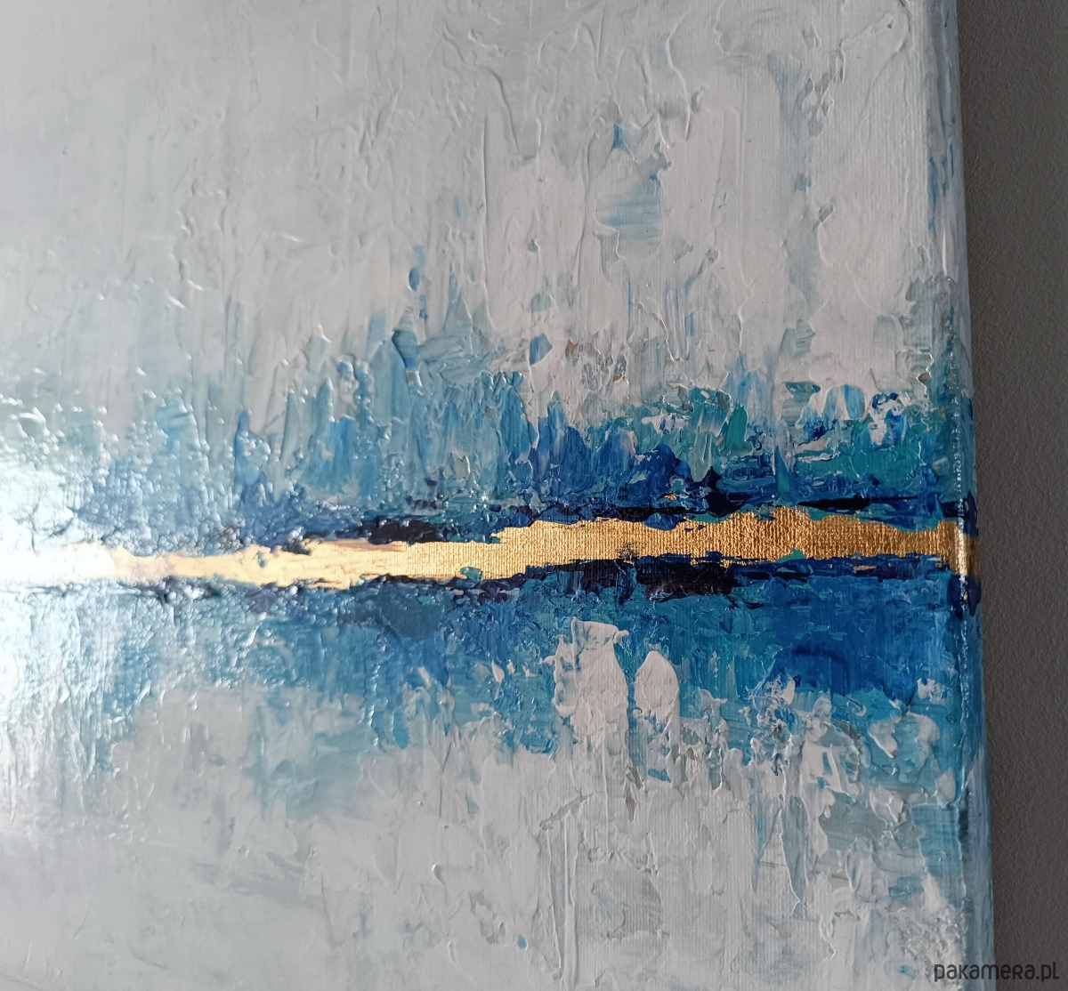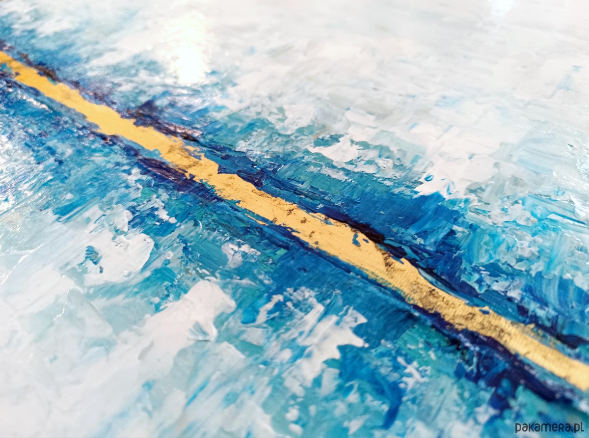 Centralnym elementem obrazu jest subtelna, złota linia wykonana ze szlagmetalu, symbolizująca światło odbijające się na linii wody. W zależności od kąta padania światła złoty akcent delikatnie mieni się, nadając całości elegancji.
