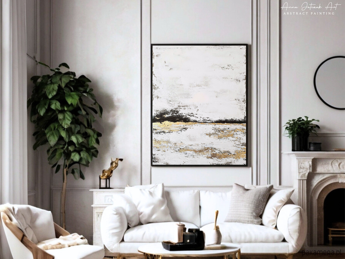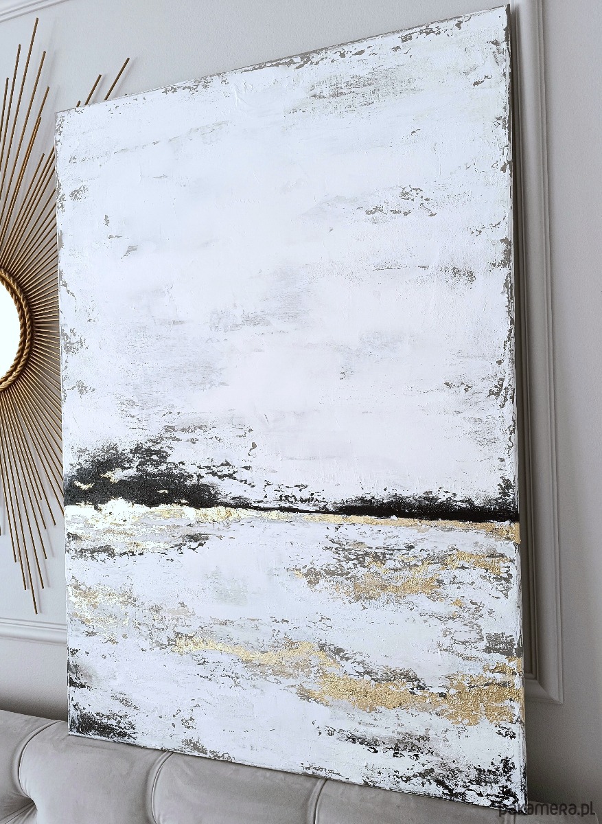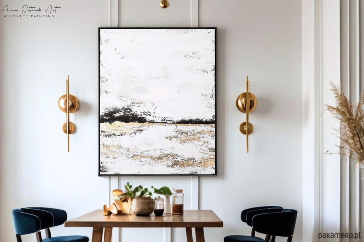 Oryginalny, ręcznie malowany obraz akrylowy, który pokazuje spokojne piękno spokojnego horyzontu. Dzieło sztuki charakteryzuje się harmonijnym połączeniem bieli, beżu, brązu, czerni i lśniącego złota, tworząc kontrast między miękkimi odcieniami ziemi a świetlistymi złotymi akcentami. Wyrazista faktura i elegancka kompozycja przywołują poczucie równowagi, ciepła i wyrafinowania. Idealny jako nowoczesna dekoracja ścienna do salonu, sypialni, biura lub przestrzeni komercyjnej, ten element wprowadza uspokajającą, ale luksusową atmosferę do każdego wnętrza.
