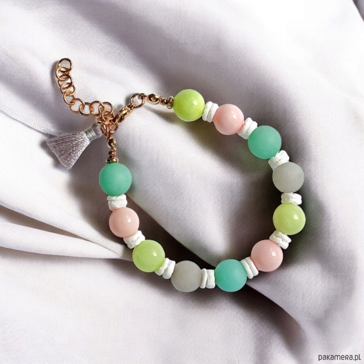 Bransoletka na solidnej lince stalowej (miękkiej) - został wykonany ze sporych kul jadeitu w 4 odcieniach - kule błysk i mat (ok.10mm) oraz nieregularnej, ciętej białej muszli - przekładki.