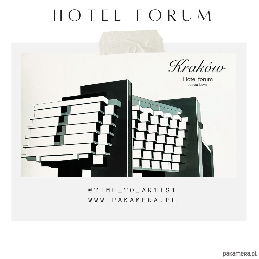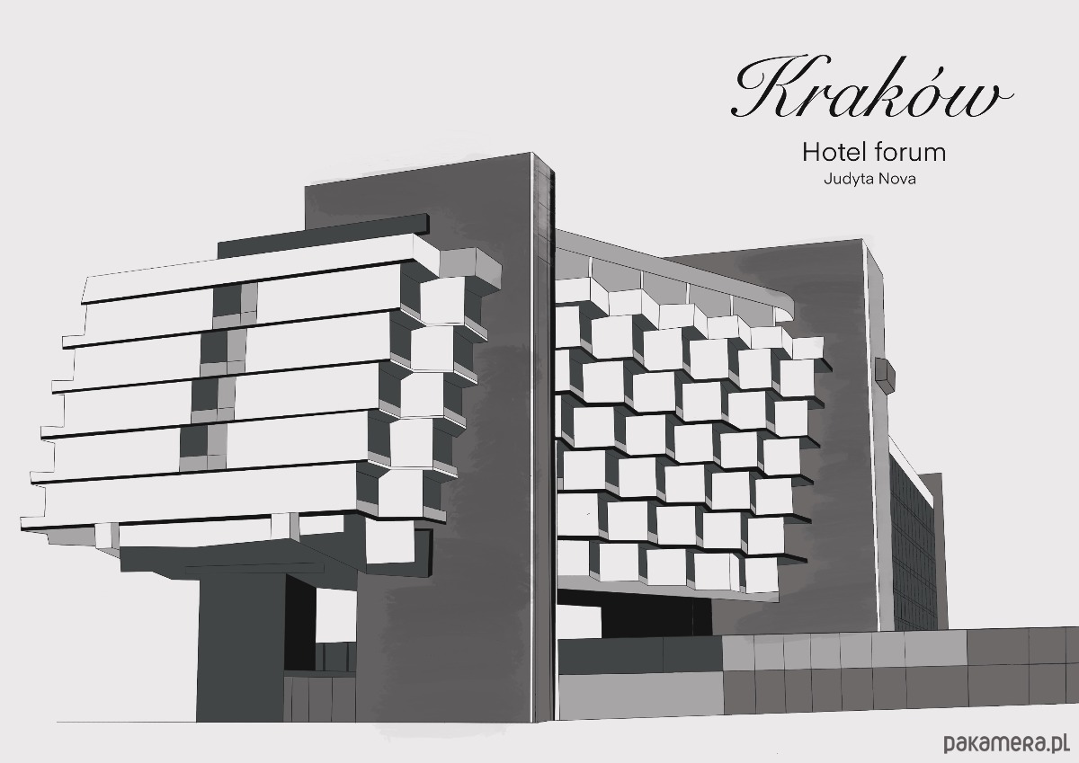 Grafika przedstawia Hotel Forum w Krakowie czarno- biały.