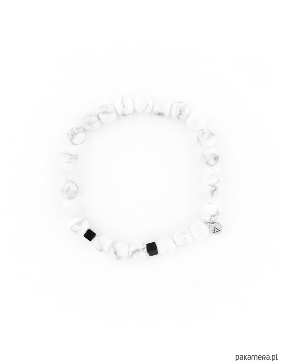 Bransoletka wykonana jest z białych Howlitów o wielkości 8mm. Jako element ozdobny proponuję dwie kosteczki z Hematytu.