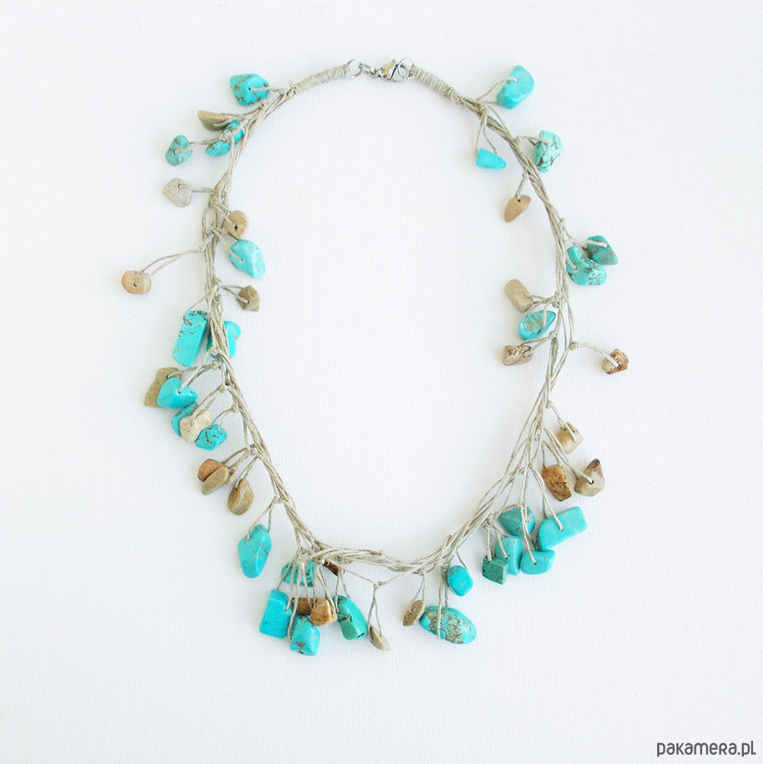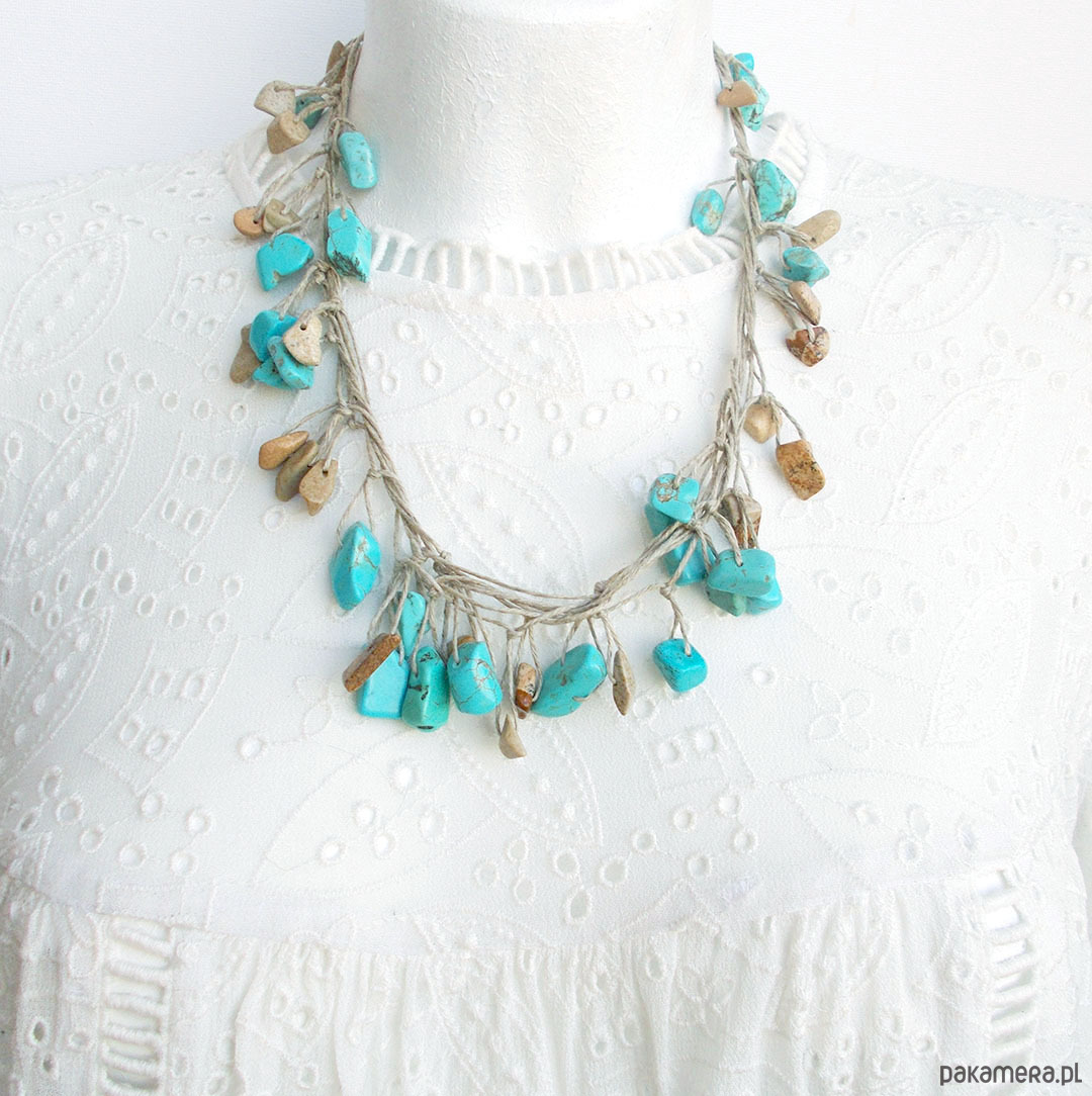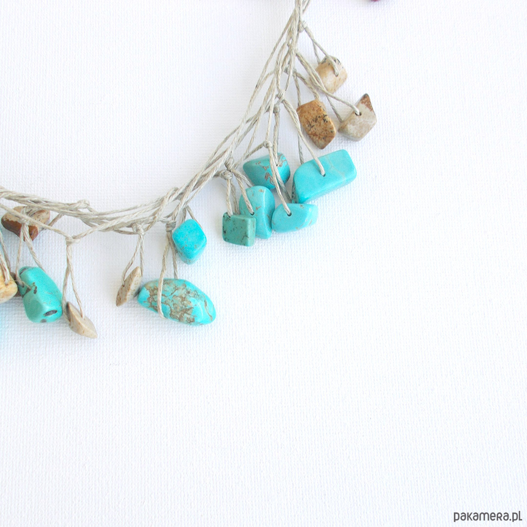 howlit turkusowy 6-20 mm, jaspis 6-14 mm, len naturalny, stal szlachetna