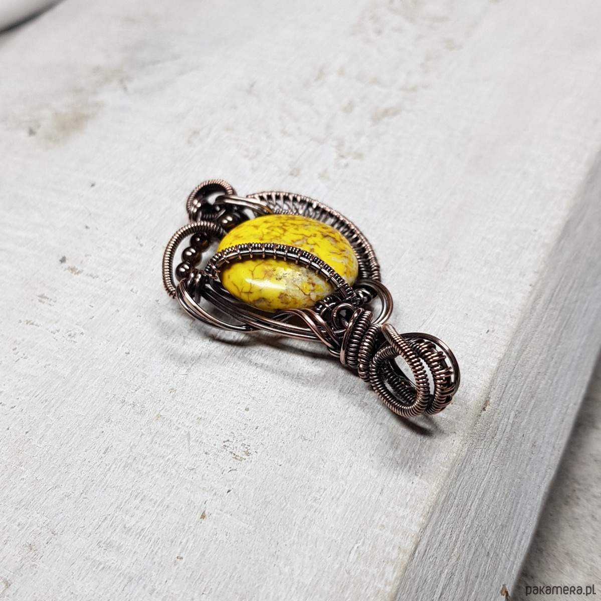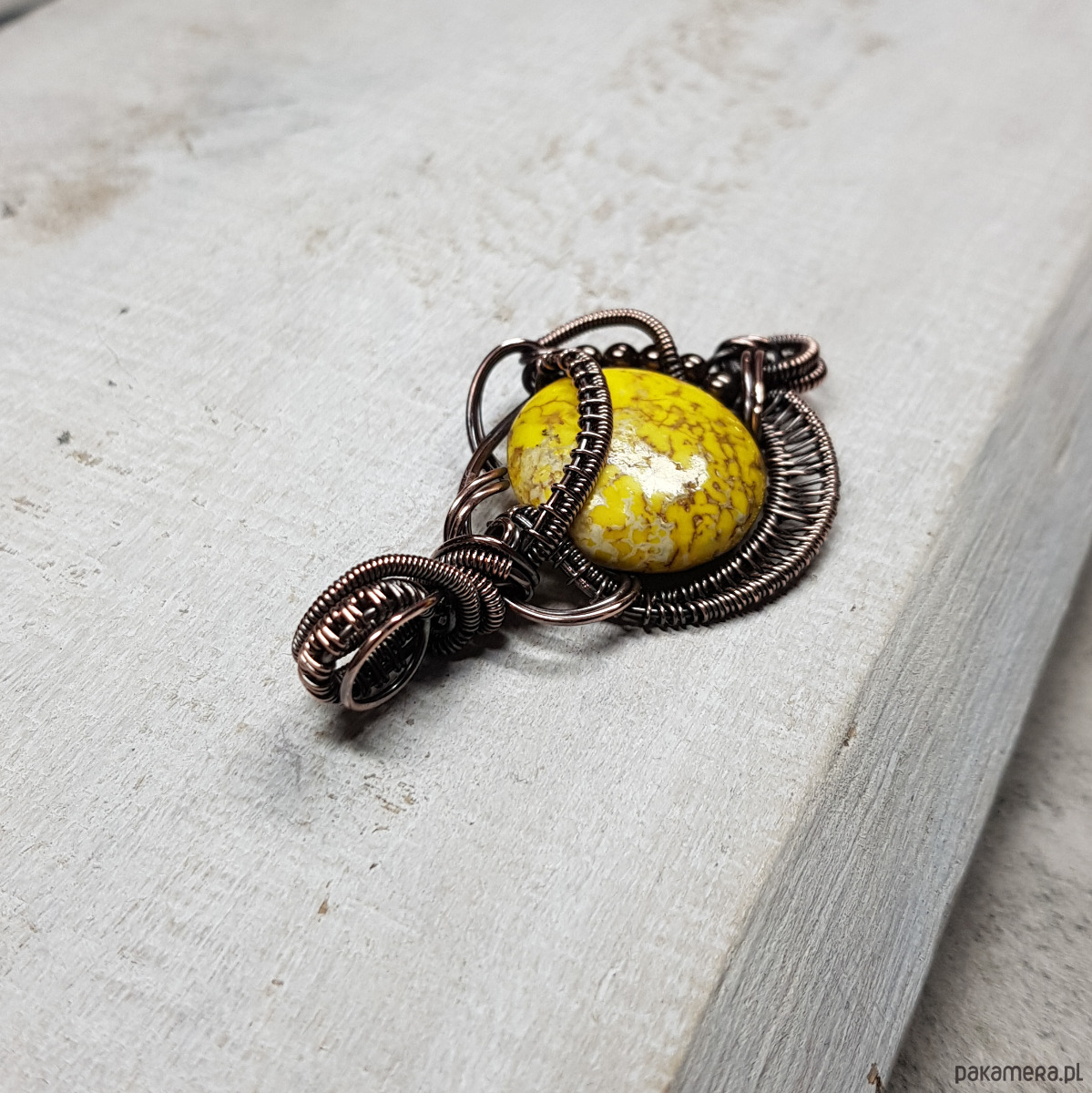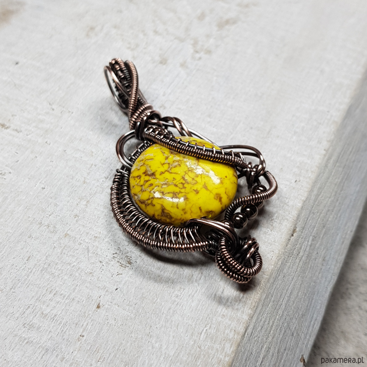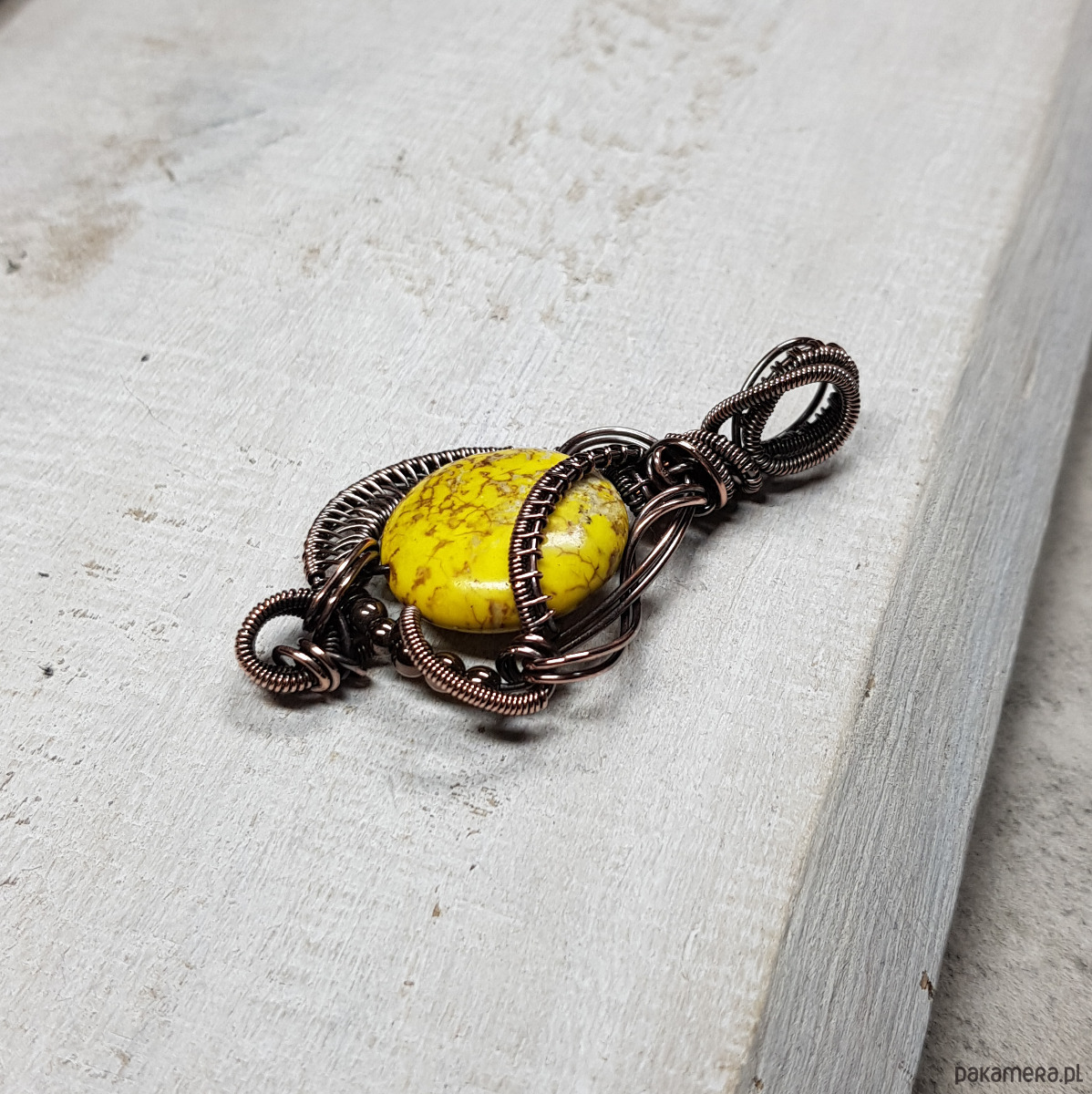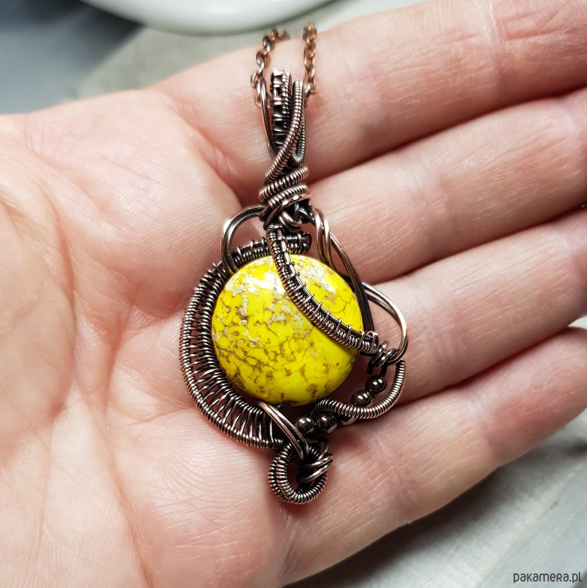 Zawieszka wykonana ręcznie metodą wire-wrappingu której głównym elementem jest howlit w kolorze żółtym. Do wykonania wisiorka użyłam drutu miedzianego, który następnie zaoksydowałam i wypolerowałam w celu uzyskania efektu szlachetnego postarzenia. Wymiary zawieszki 57x30mm z łańcuszkiem długości około 45-50 cm.