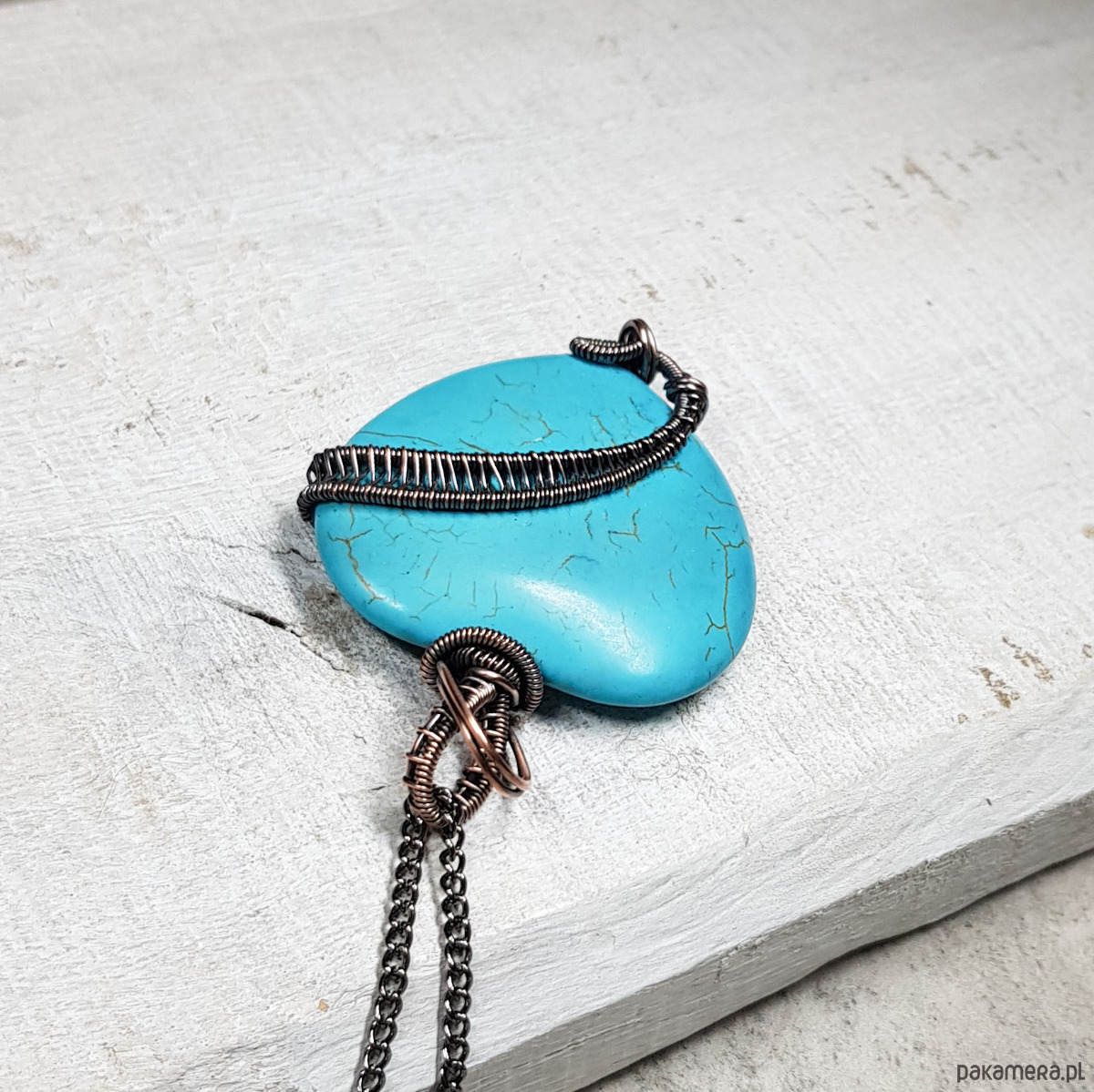 Zawieszka wykonana ręcznie metodą wire-wrappingu której głównym elementem jest howlit w kształcie serca kolorze turkusowym. Do wykonania wisiorka użyłam drutu miedzianego, który następnie zaoksydowałam i wypolerowałam w celu uzyskania efektu szlachetnego postarzenia. Wymiary zawieszki 57x40mm z łańcuszkiem długości około 45-50 cm.
