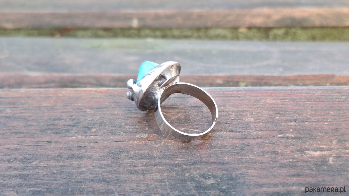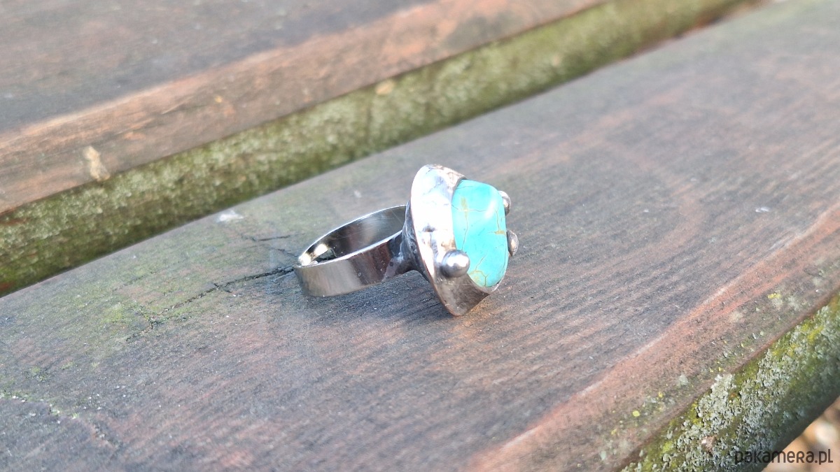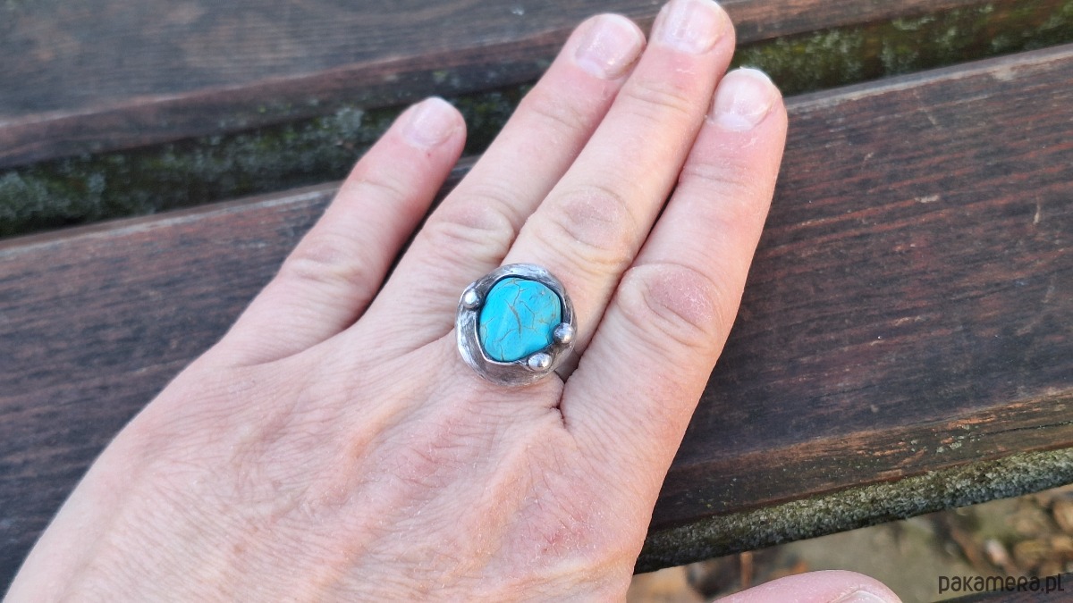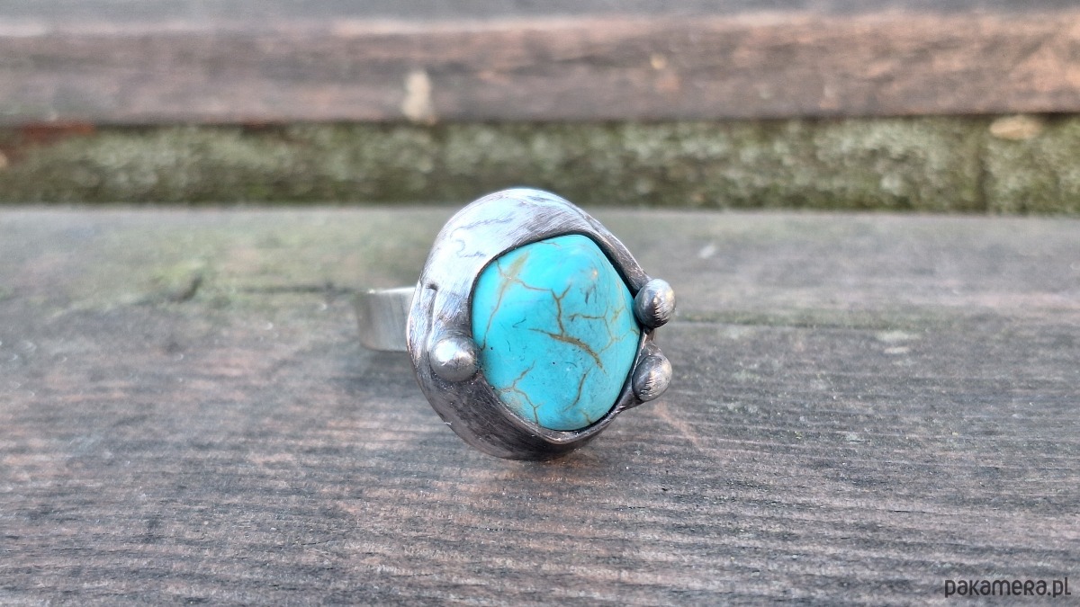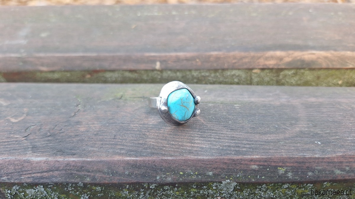 Pierścionek wykonany z miedzi, cyny i howlitu. Wymiary ok. 2 na 1.8 cm. Regulowany. Nie jest ciężki.