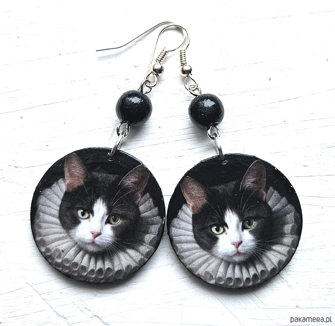 kolczyki drewniane, ozdobione metodą decoupage, dwustronne, starannie wykończone farbami akrylowymi i zabezpieczone wielokrotnie lakierem, drewniane koraliki, bigle posrebrzane, długość kolczyków bez bigli: 4,5 cm, średnica: 3 cm, bardzo lekkie
