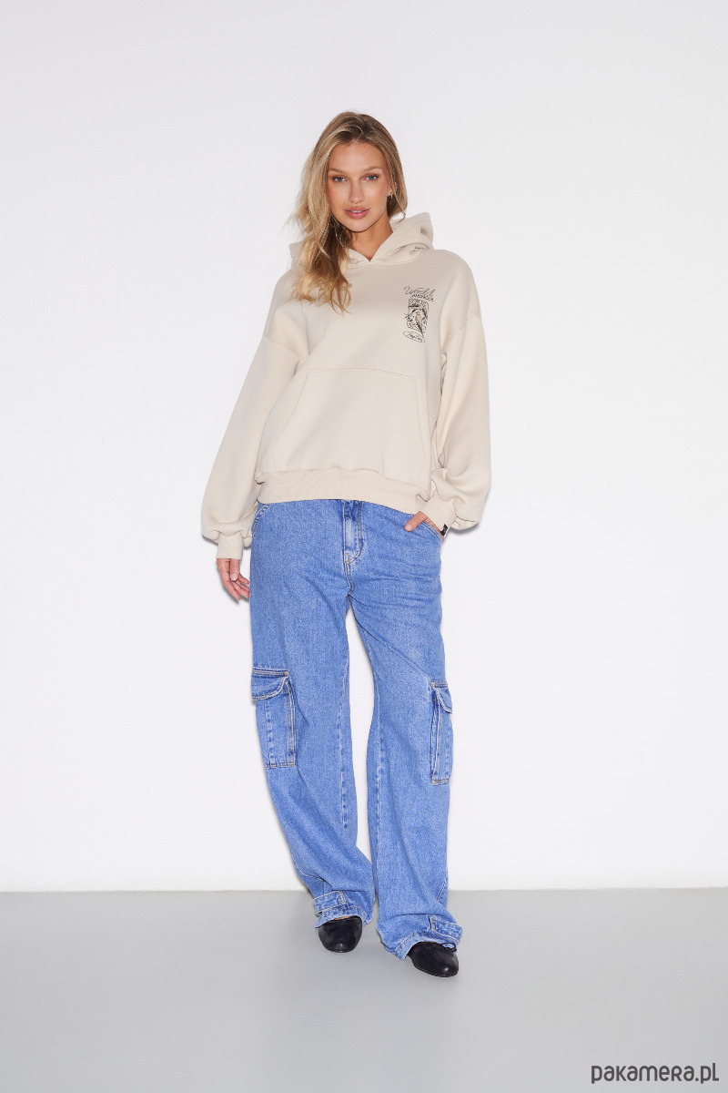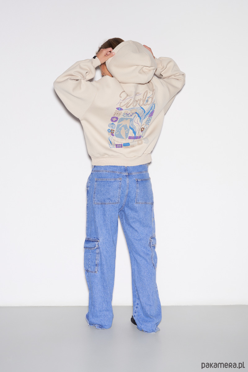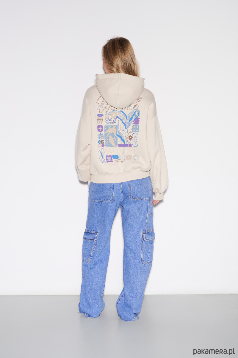 Krój jest nieco krótszy niż nasze standardowe bluzy i delikatnie zwęża się ku dołowi. Powoduje to, że ten model jest bardzo uniwersalny i dobrze układa się na różnych typach sylwetek. Ściągacz na dole tworzy subtelną bombkę, dzięki czemu możesz podwinąć bluzę i dopasować proporcje albo zostawić ją luźno, tak aby spod spodu wystawał t-shirt. Rękawy mają obniżoną linię, są bardzo obszerne i efektownie bufiaste przy mankietach. Z przodu znajduje się pojemna kieszeń kangurka i mały nadruk na piersi a na plecach pełnowymiarowa grafika.