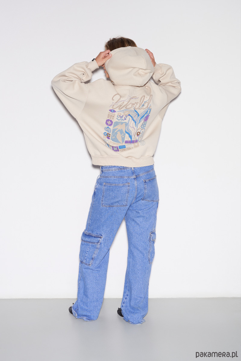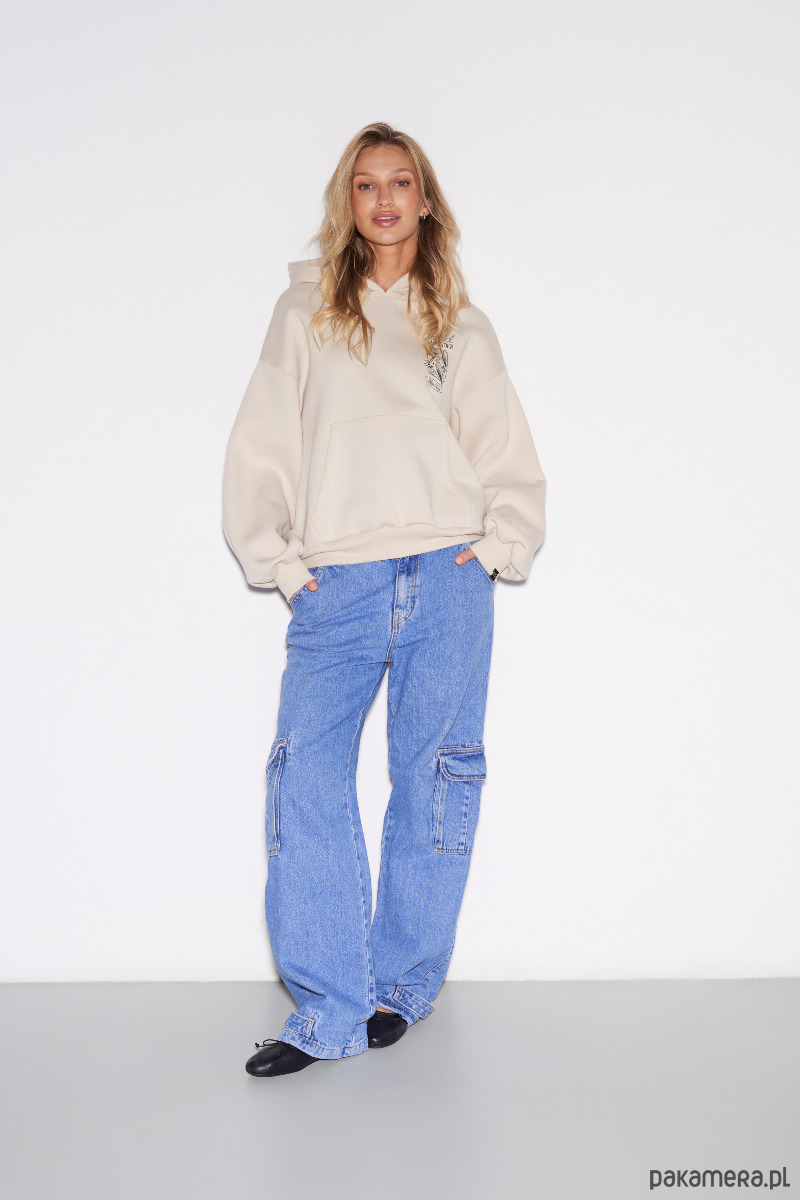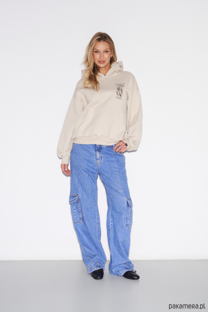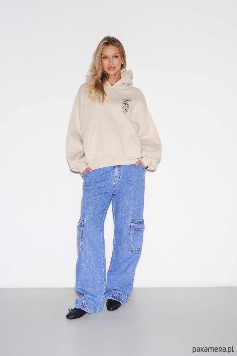 Krój jest nieco krótszy niż nasze standardowe bluzy i delikatnie zwęża się ku dołowi. Powoduje to, że ten model jest bardzo uniwersalny i dobrze układa się na różnych typach sylwetek. Ściągacz na dole tworzy subtelną bombkę, dzięki czemu możesz podwinąć bluzę i dopasować proporcje albo zostawić ją luźno, tak aby spod spodu wystawał t-shirt. Rękawy mają obniżoną linię, są bardzo obszerne i efektownie bufiaste przy mankietach. Z przodu znajduje się pojemna kieszeń kangurka i mały nadruk na piersi a na plecach pełnowymiarowa grafika.