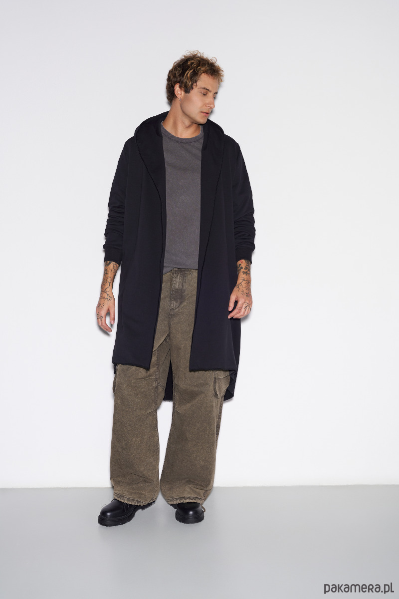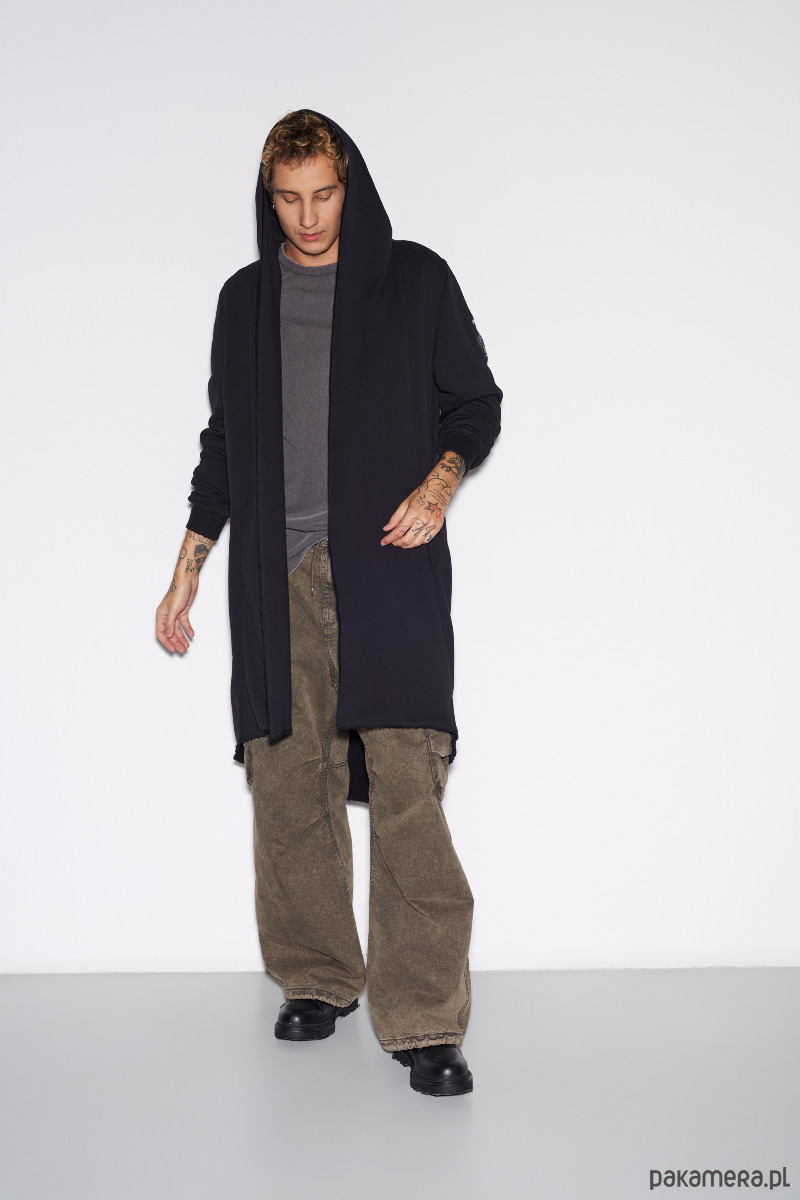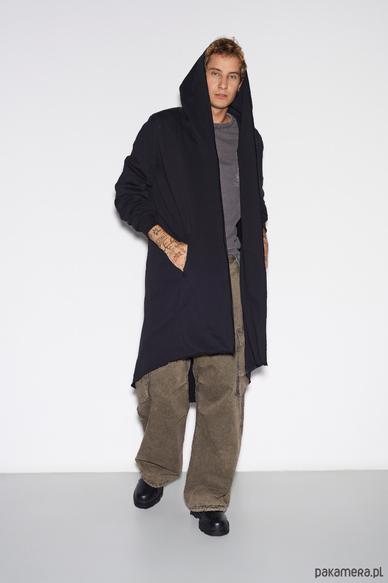 Dzianinowy płaszcz to jeden z tych elementów garderoby, w których nie da się przejść niezauważonym. Awangardowy i wyrazisty, a jednocześnie zaskakująco uniwersalny - idealny zarówno jako warstwa wierzchnia, jak i efektowna alternatywa dla bluzy. Charakterystyczny, obszerny i asymetryczny krój z krótszym przodem i mocno wydłużonym tyłem nadaje mu niepowtarzalnego charakteru. Ciężkie przednie klapy można nosić na sobie lub puścić luźno rozłożone, dzięki czemu sylwetka zyskuje nowy, dynamiczny kształt. Płaszcz posiada kaptur, rękawy zakończone ściągaczem i wpuszczane kieszenie boczne, które dodają funkcjonalności.