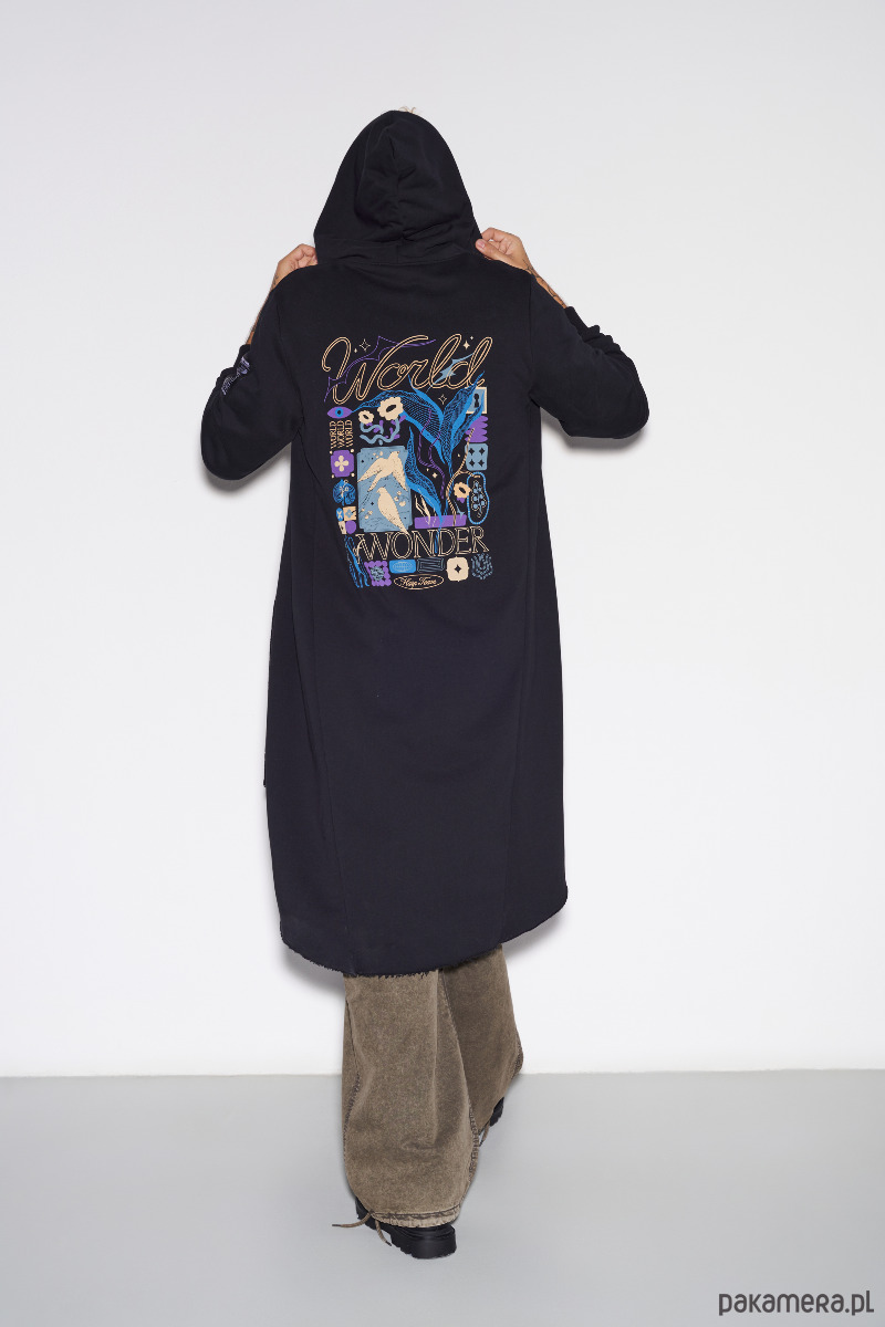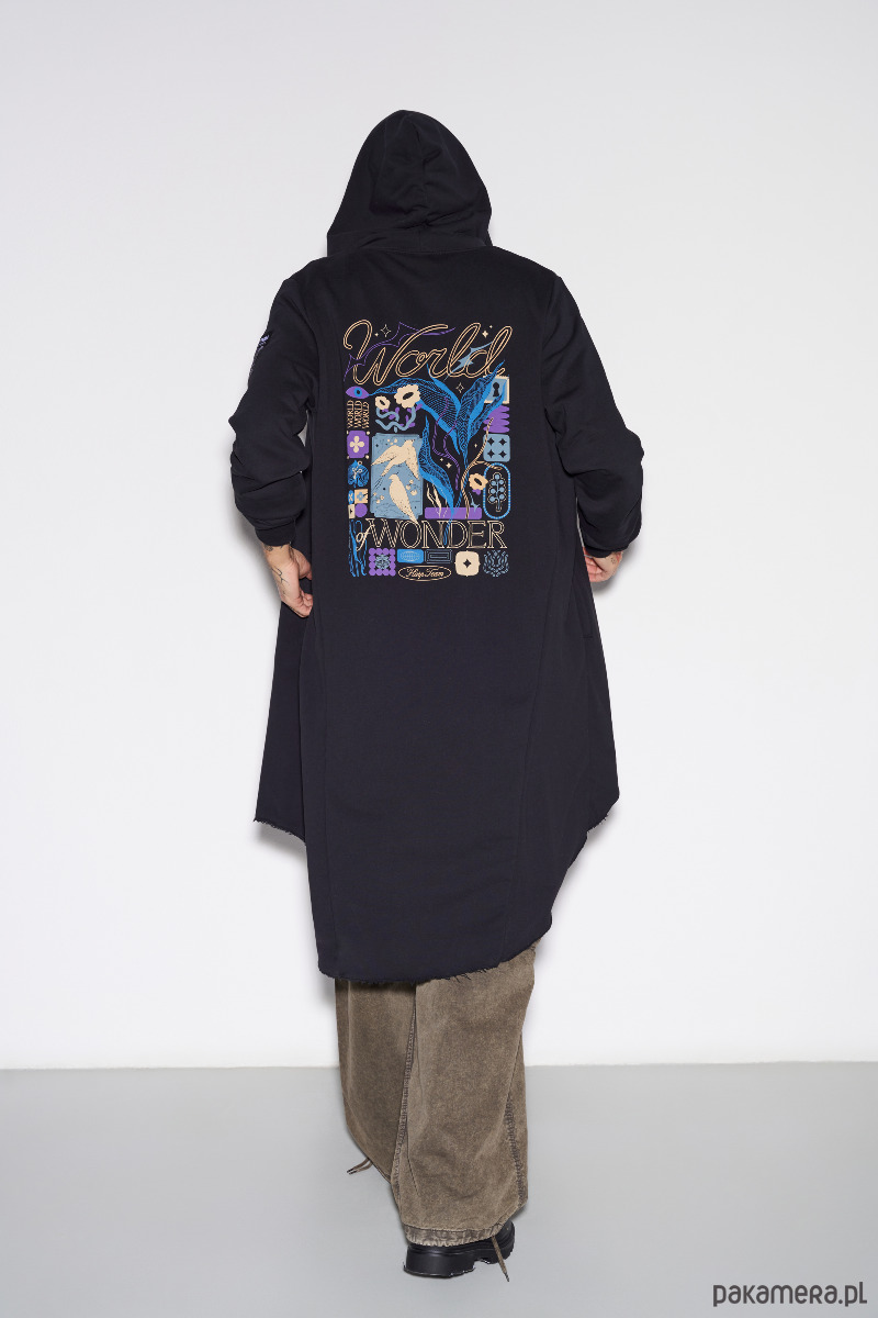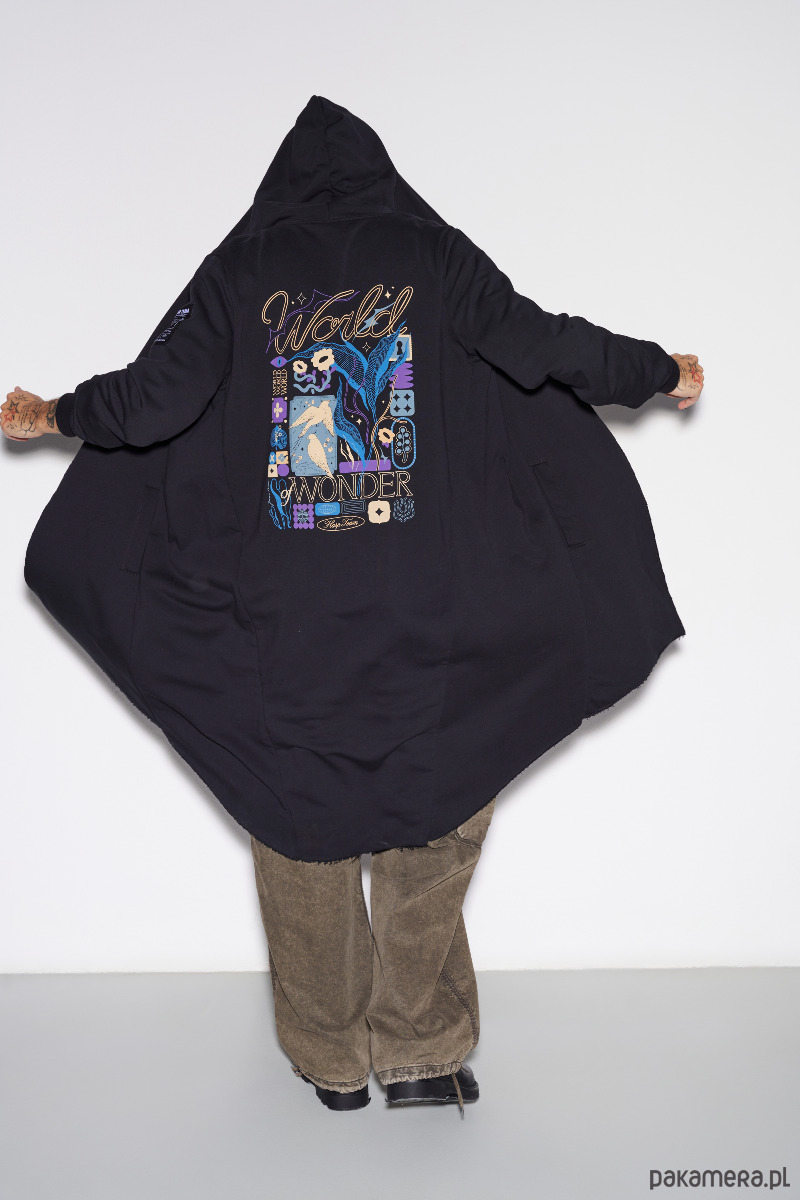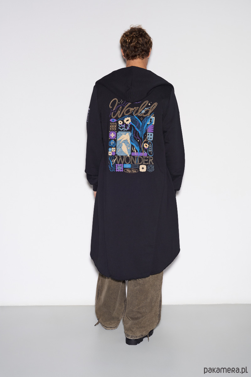 Dzianinowy płaszcz to jeden z tych elementów garderoby, w których nie da się przejść niezauważonym. Awangardowy i wyrazisty, a jednocześnie zaskakująco uniwersalny - idealny zarówno jako warstwa wierzchnia, jak i efektowna alternatywa dla bluzy. Charakterystyczny, obszerny i asymetryczny krój z krótszym przodem i mocno wydłużonym tyłem nadaje mu niepowtarzalnego charakteru. Ciężkie przednie klapy można nosić na sobie lub puścić luźno rozłożone, dzięki czemu sylwetka zyskuje nowy, dynamiczny kształt. Płaszcz posiada kaptur, rękawy zakończone ściągaczem i wpuszczane kieszenie boczne, które dodają funkcjonalności.