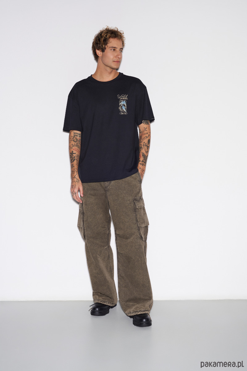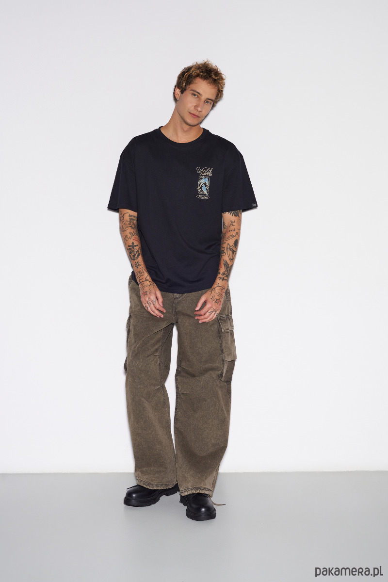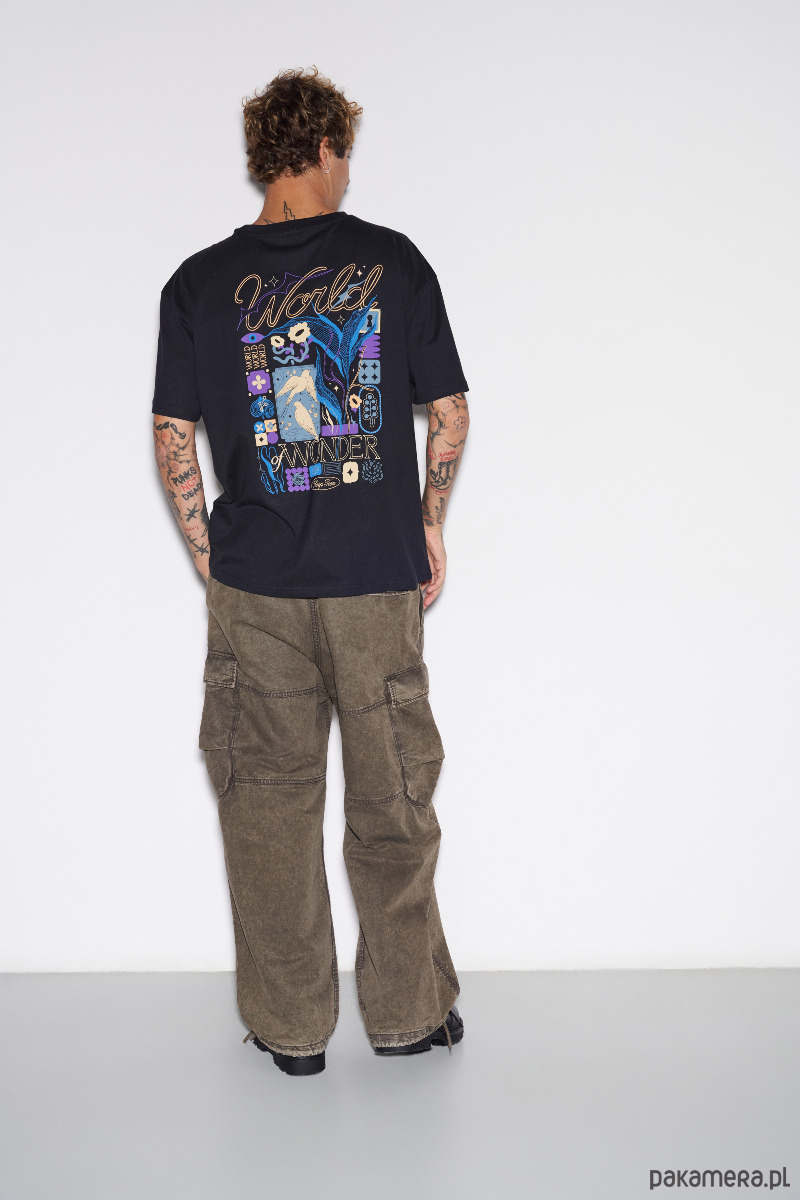 Koszulka męska o regularnym kroju z małym nadrukiem na piersi i dużą grafiką na plecach. Klasyczny charakter łączy się tu z nowoczesnym detalem. Prosty fason dobrze układa się na sylwetce i sprawia, że to pewna baza w każdej szafie. Stonowany kolor ułatwi budowanie prostych, spójnych outfitów bez zastanawiania się nad dopasowaniem.