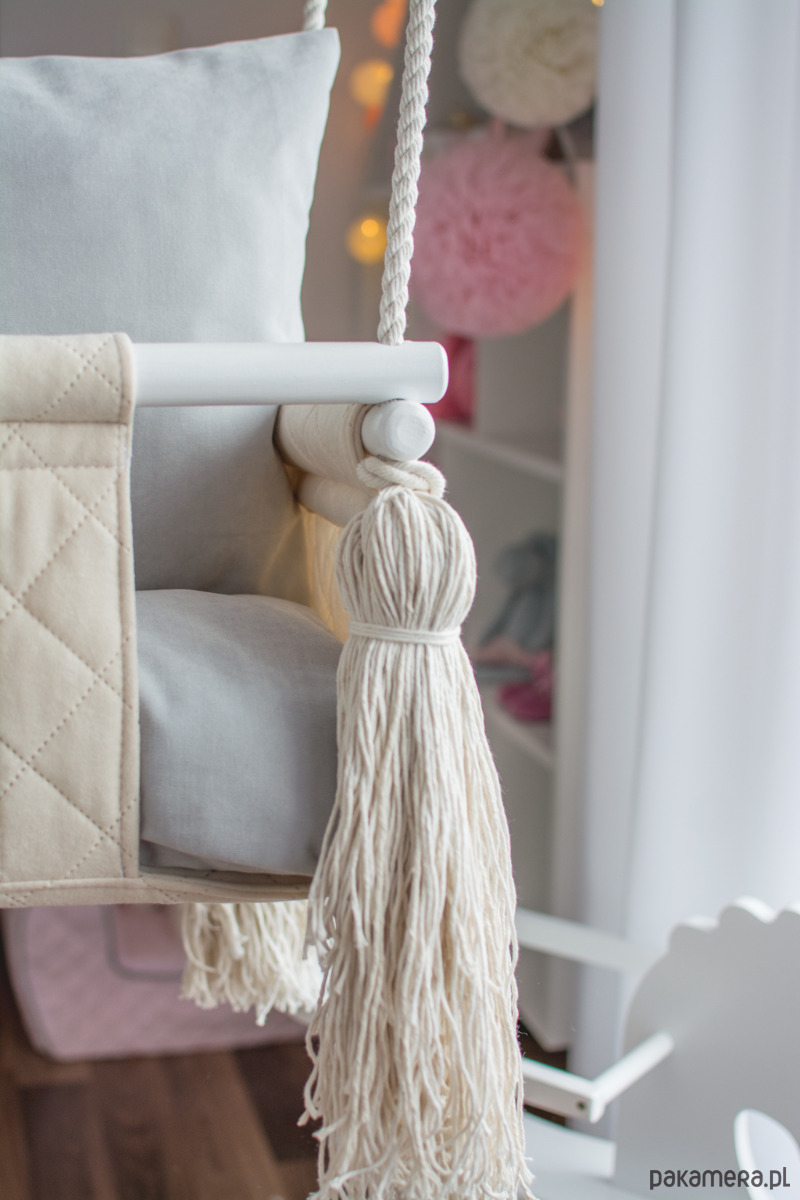 Do lin (koło siedziska) mocowane są 4 grube pompony wykonane z przędzy bawełnianej, które dodają huśtawce dodatkowego uroku.
