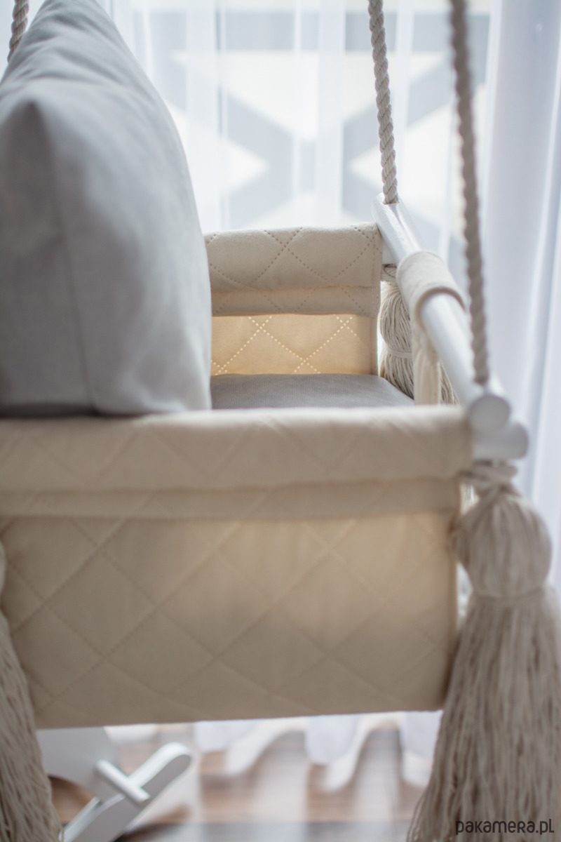 Huśtawka jest wykonana z wytrzymałej tkaniny pikowanej w kolorze kremowym, dzięki czemu uzyskuje piękny i naturalny wygląd.