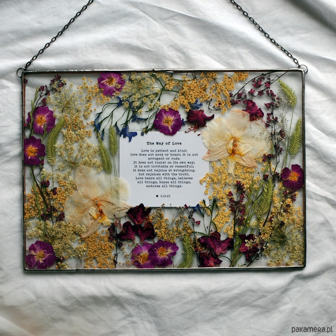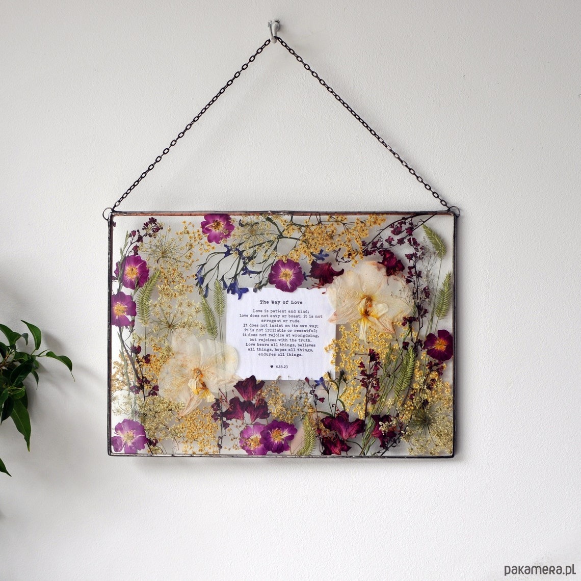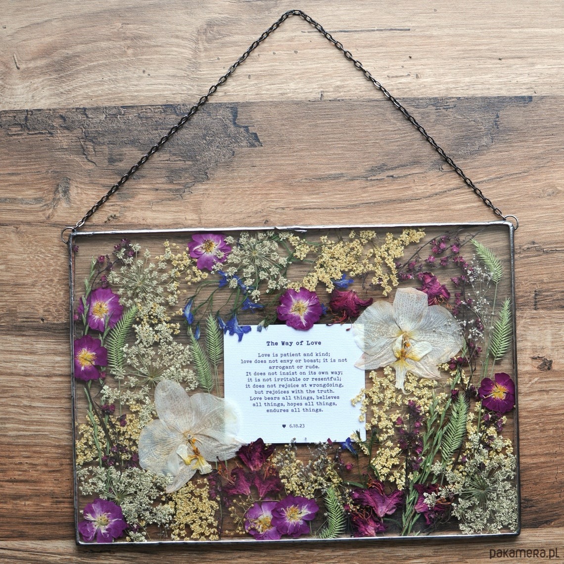 Dekoracyjny witraż z kompozycją z suszonych roślin wykonany w całości w pracowni rękodzieła MARIAELA.