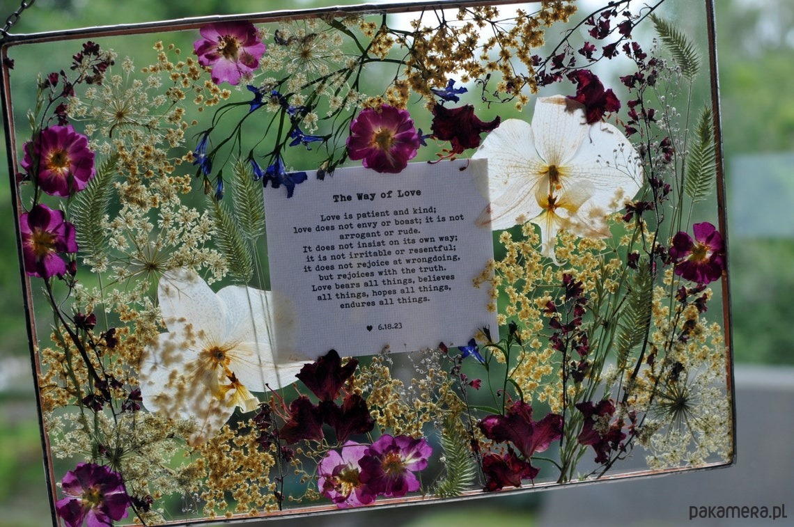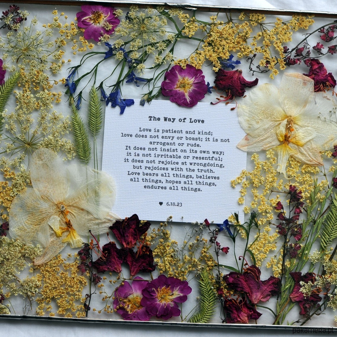 Rozmaite suszone kwiaty zamknięte w oryginalnym wzorze dekoracyjnym, oplatają wydrukowany tekst.