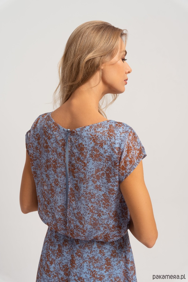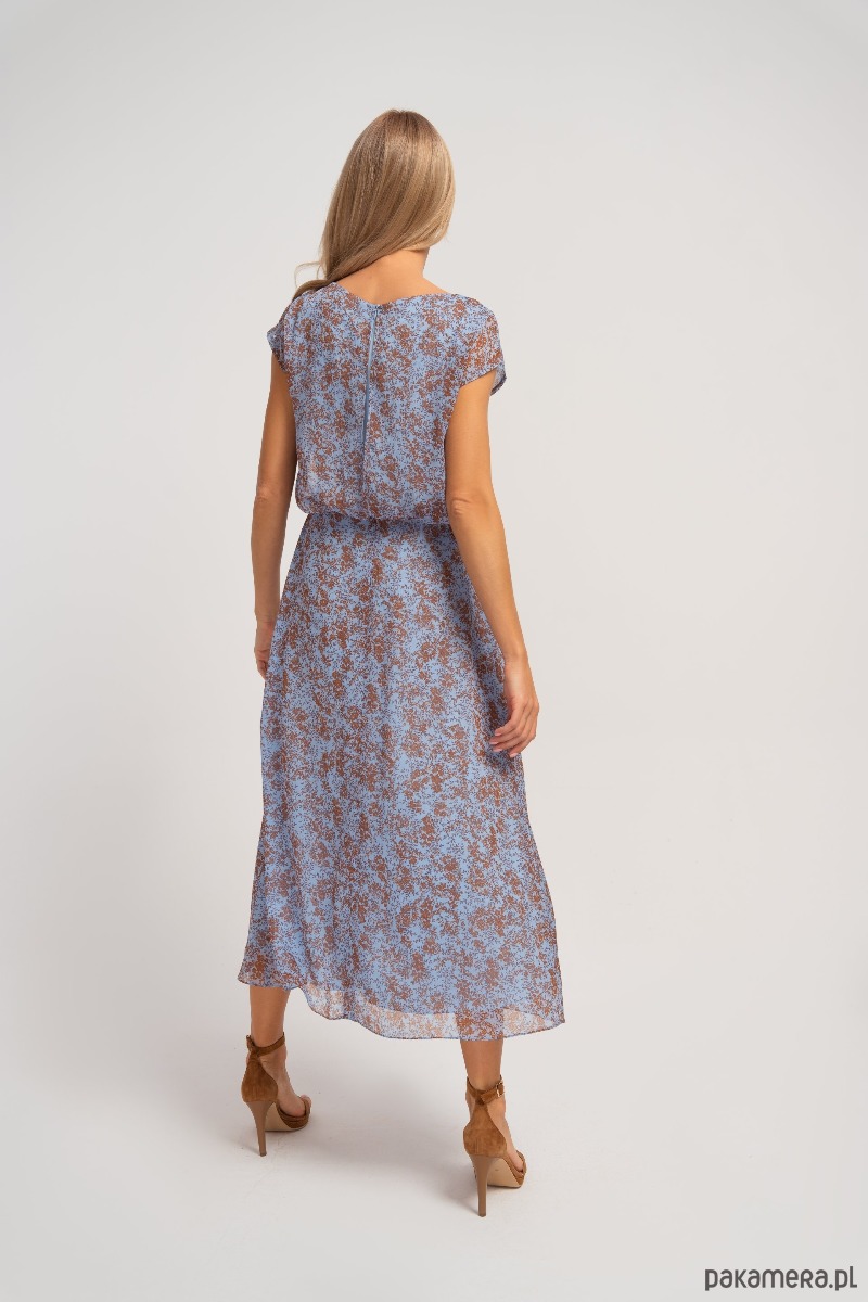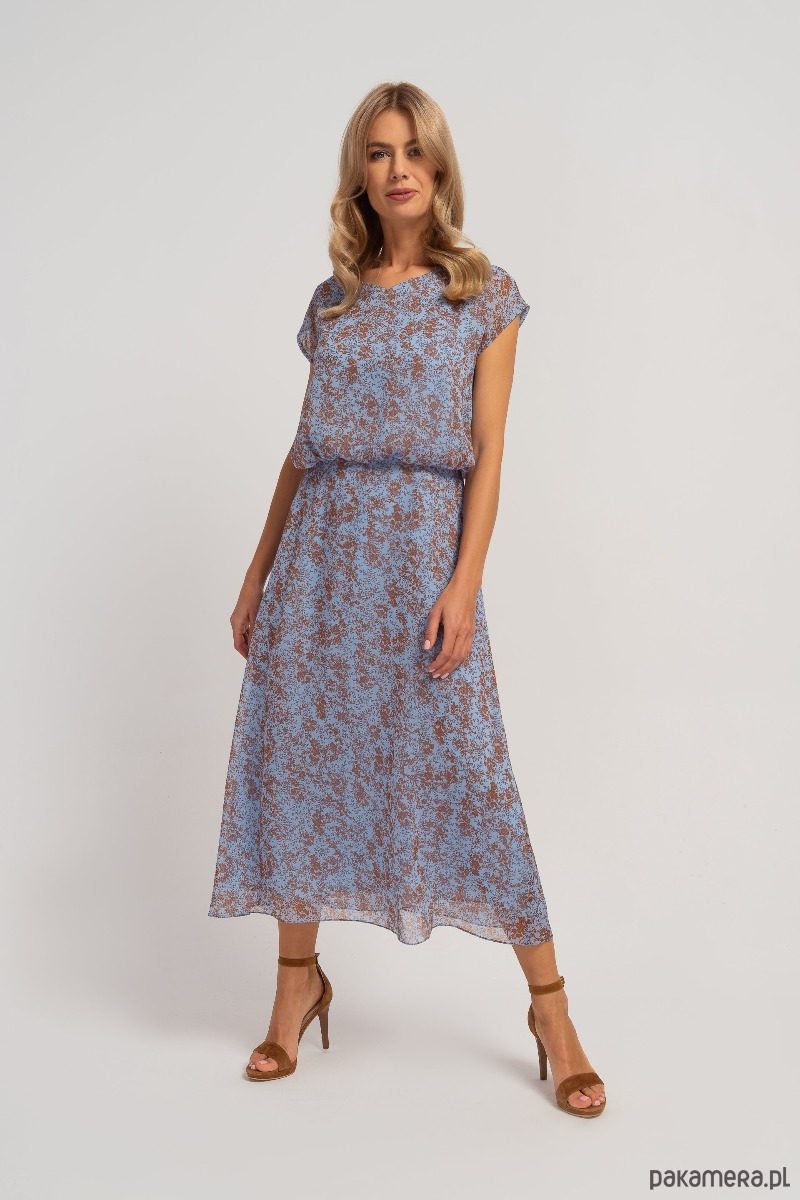 Długa sukienka maxi, uszyta ze zwiewnej, szyfonowej tkaniny. Bez rękawów, dekolt w klasyczny serek. Luźny swobodny krój, zebrany gumką w talii, podkreśla kobiecy charakter. Uniwersalna długość maxi. Sukienka zapinana jest z tyłu na kryty suwak, dodatkowo w tym miejscu znajduje się eleganckie rozcięcie. Model na błękitnej podszewce - dół lekko prześwitujący.