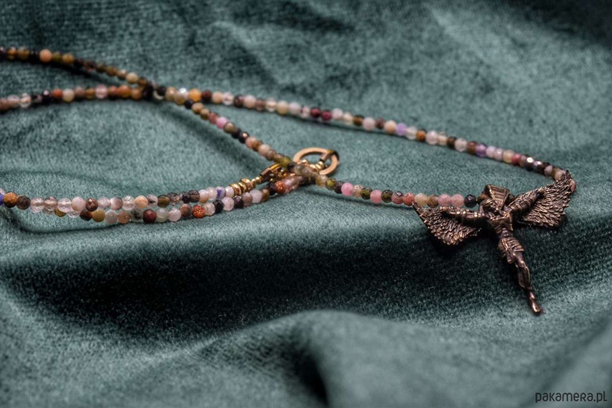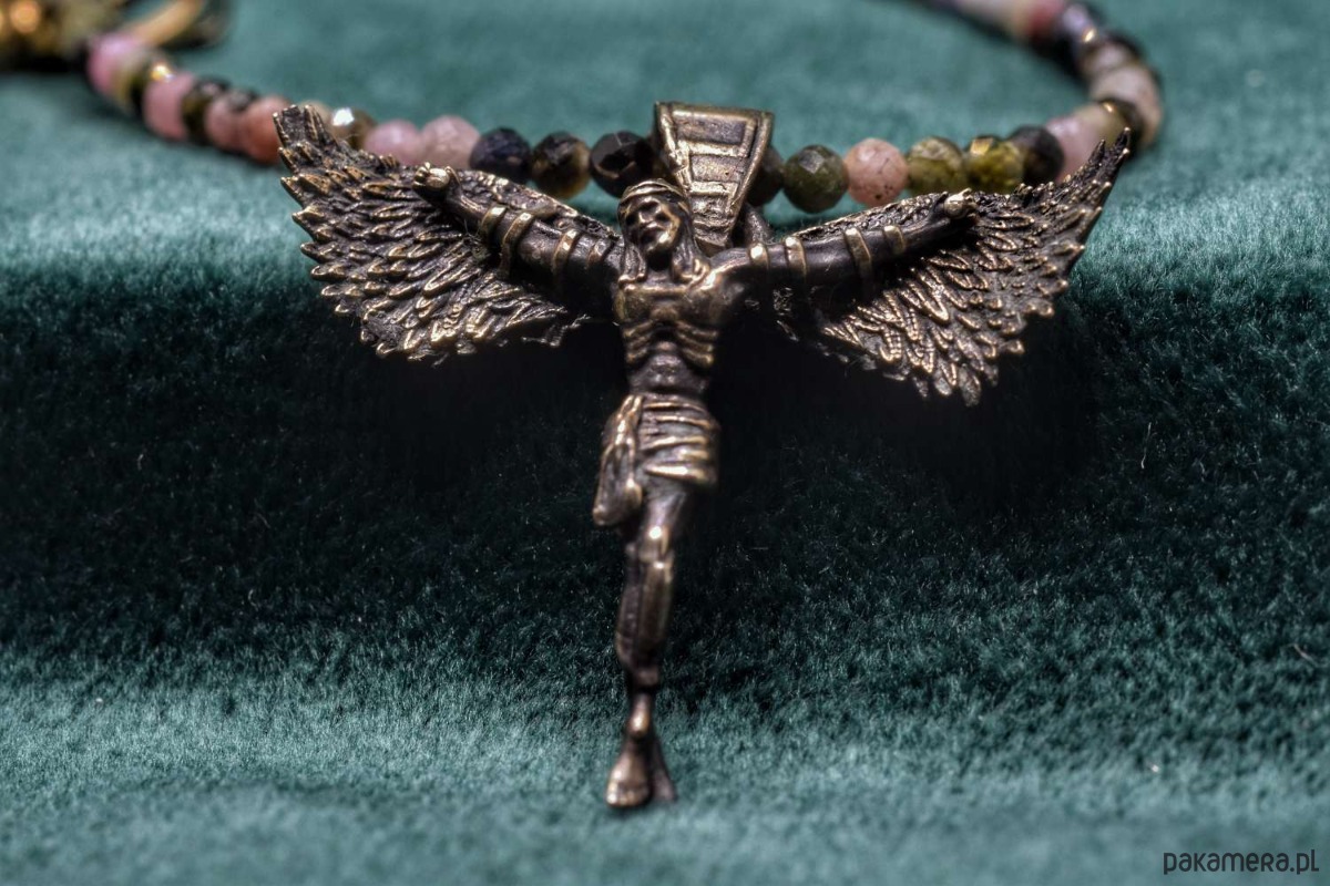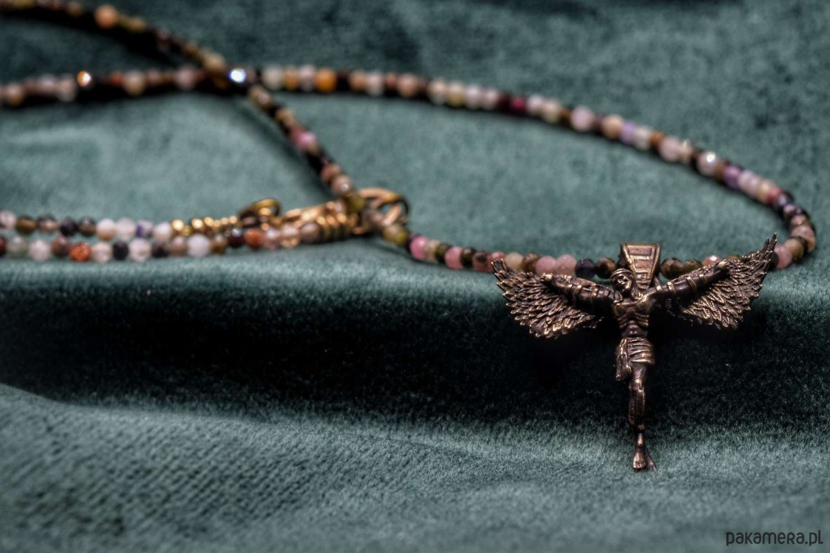 Naszyjnik z projektu "Icarus-Christus". Odlany w brązie. Koralinki z naturalnych kamieni półszlachetnych w miksie.