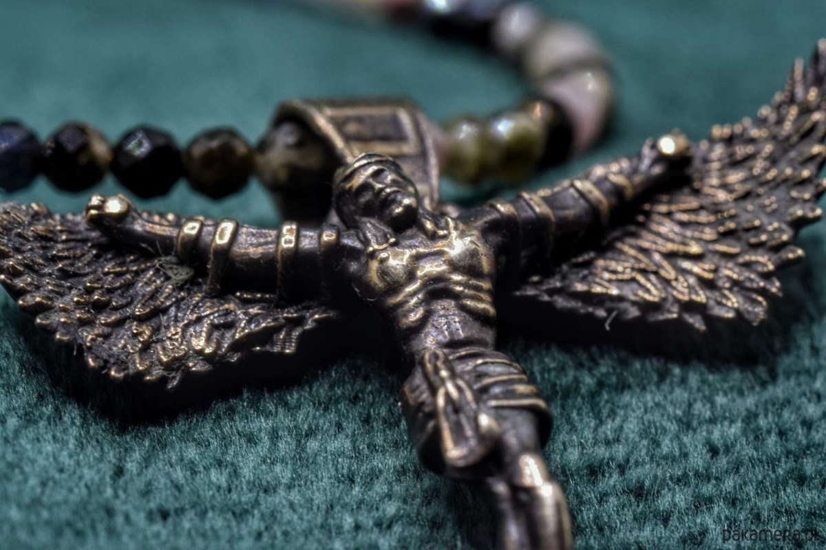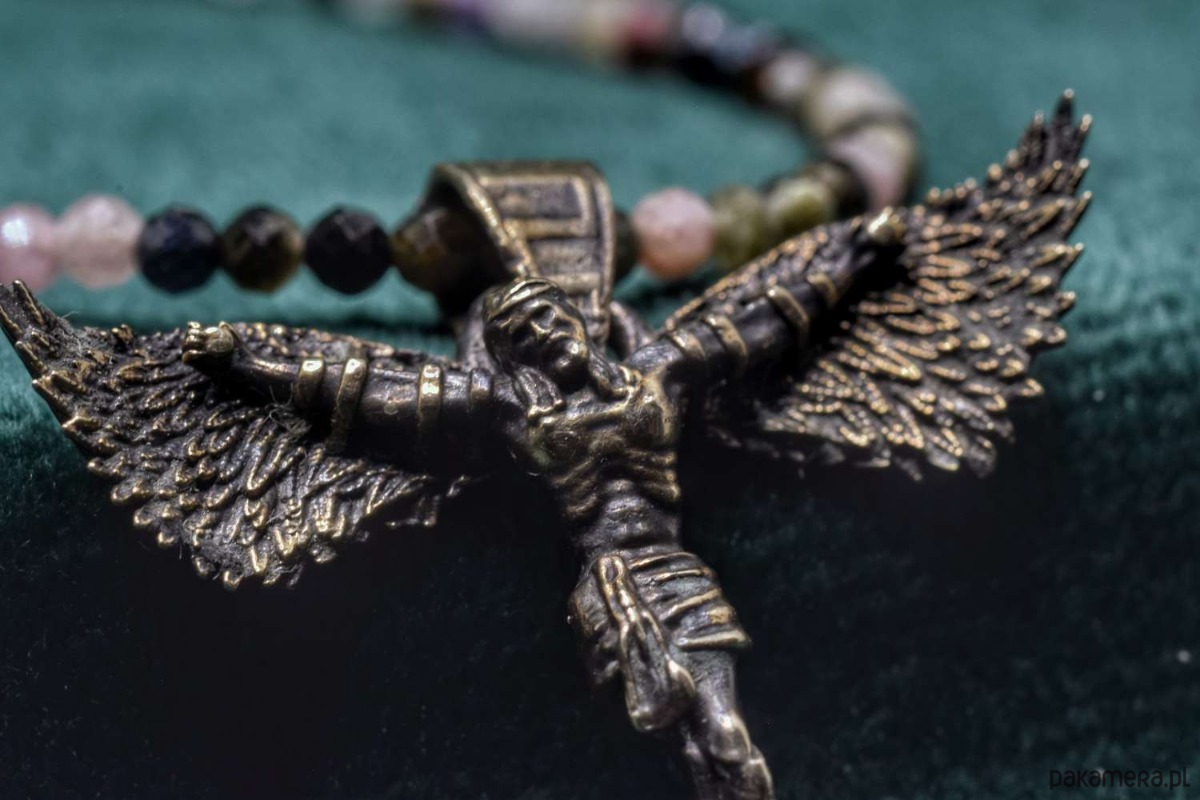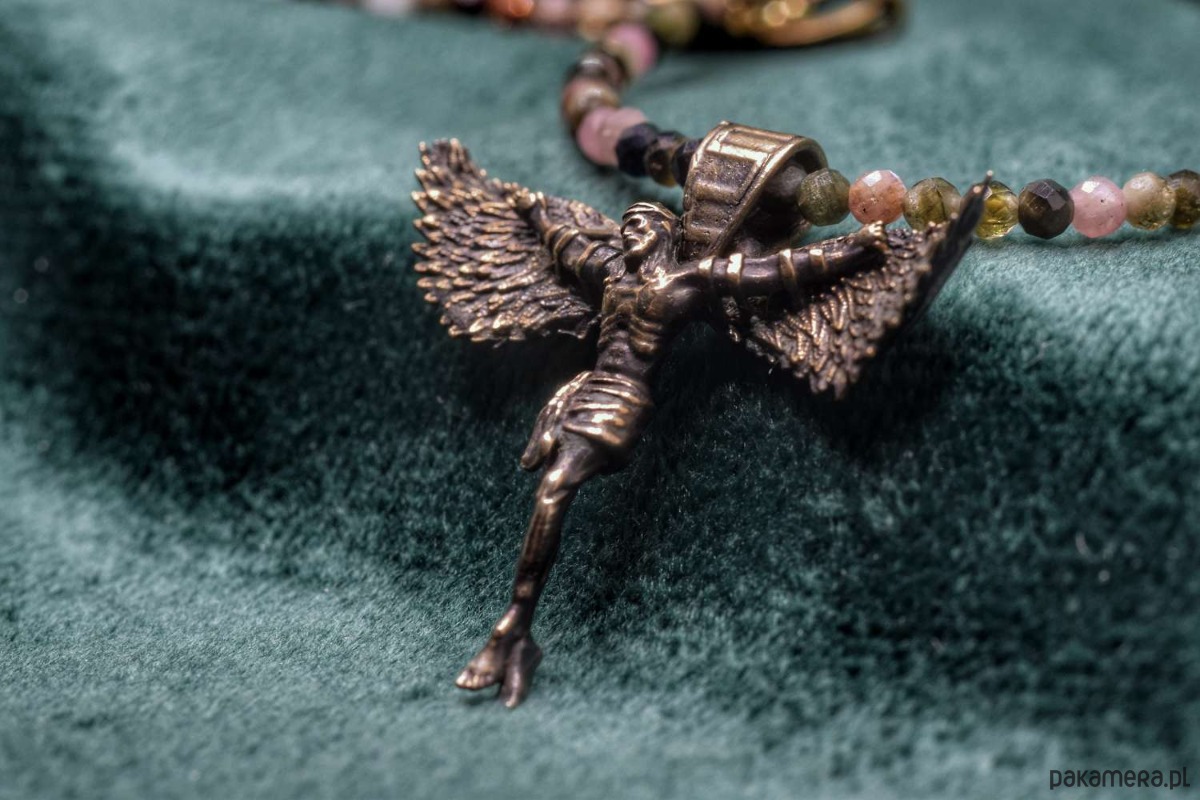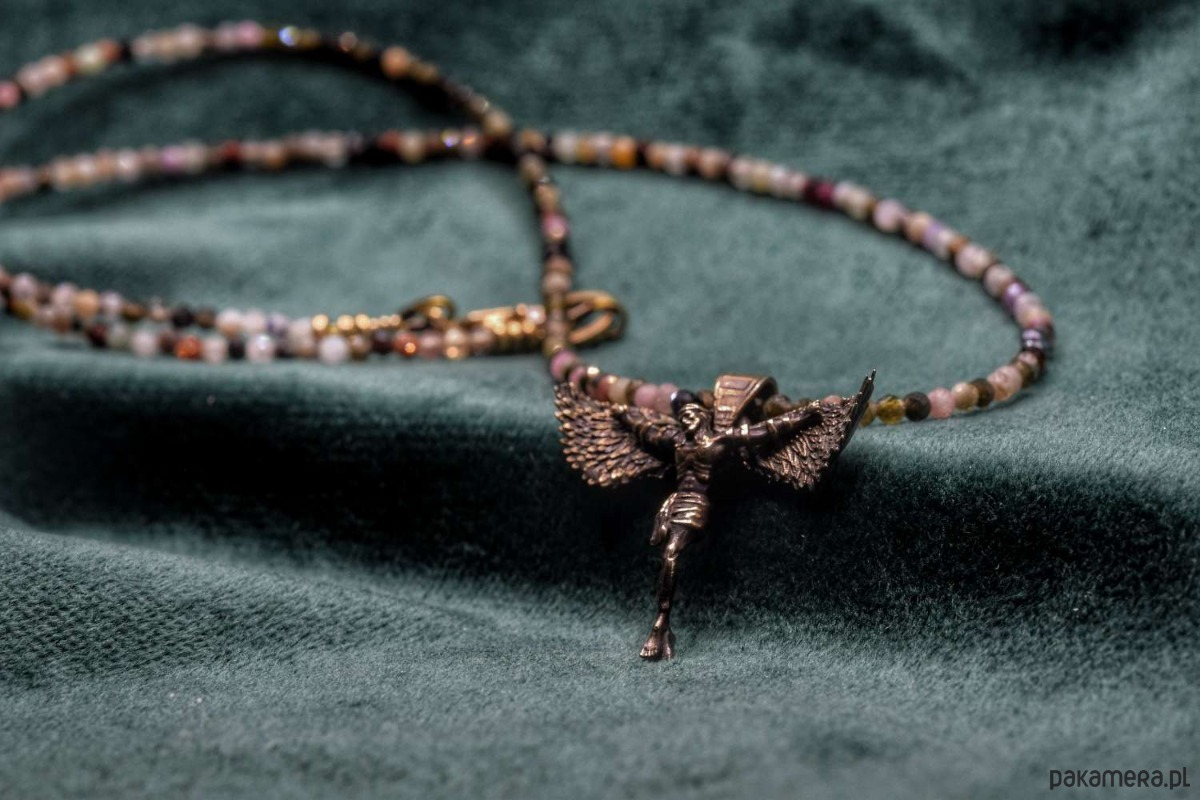 Naszyjnik z projektu "Icarus-Christus". Odlany w brązie. Koralinki z naturalnych kamieni półszlachetnych w miksie.