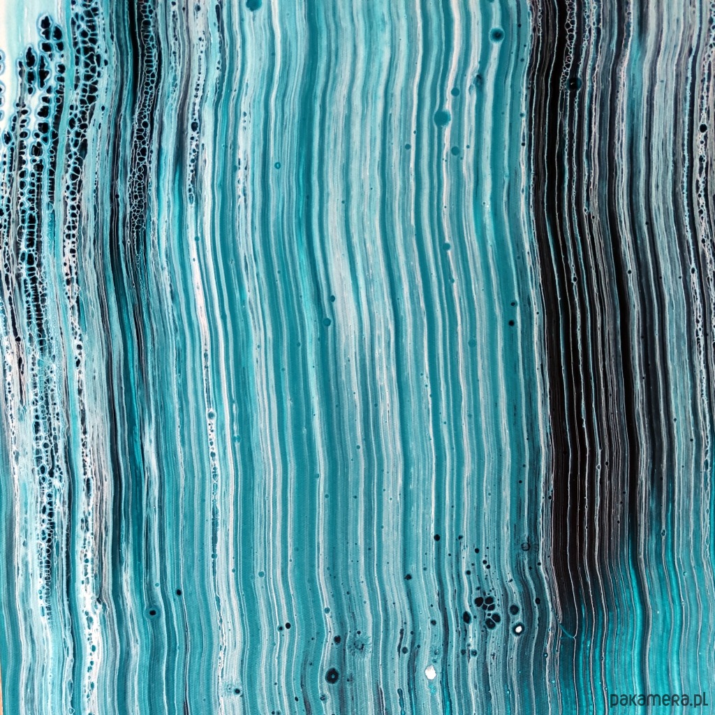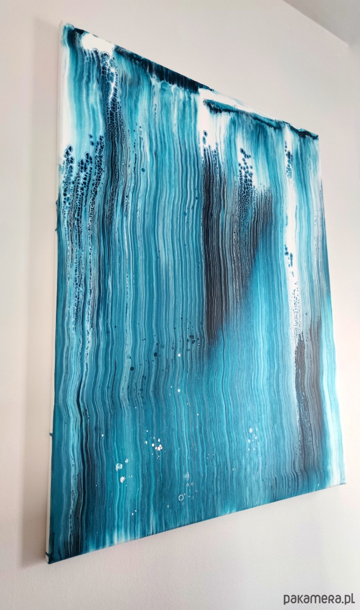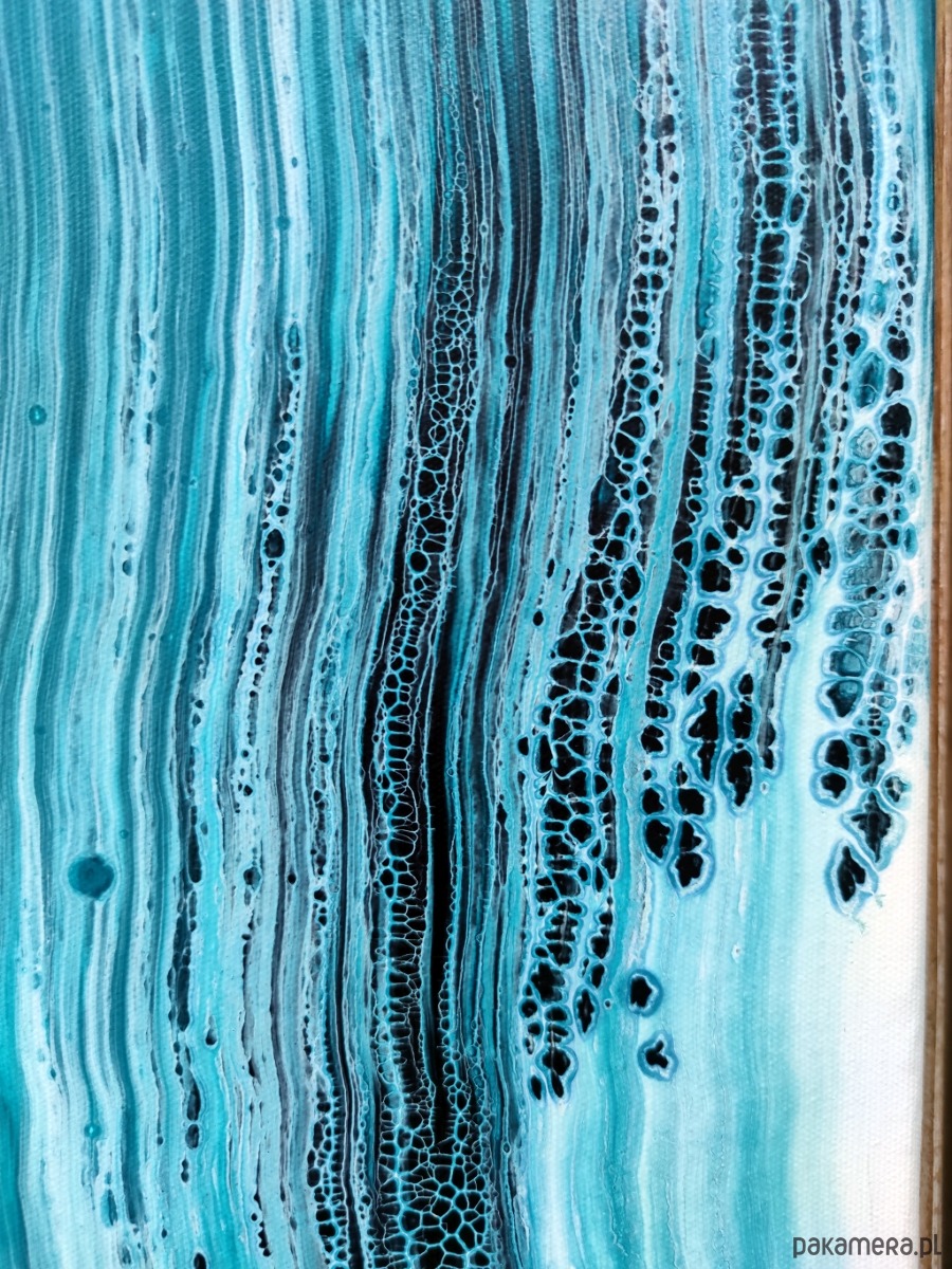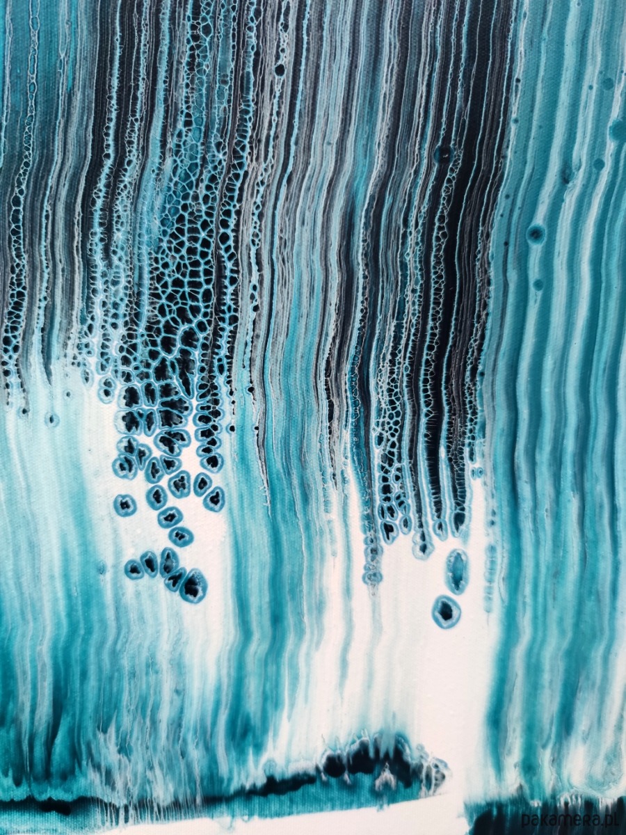 ICEBREAKER. Obraz abstrakcyjny malowany farbami akrylowymi na dobrej jakości podobraziu bawełnianym produkcji polskiej. Wykorzystałam zieleń ultramaryna i granat marynarski w połączeniu z bielą. Zastosowałam tutaj technikę pouringu, czyli wylewania obrazów i łączenia farb kiedy mają jeszcze płynną konsystenję. Wspaniały detal!