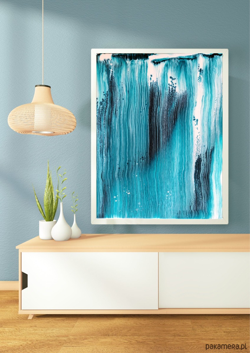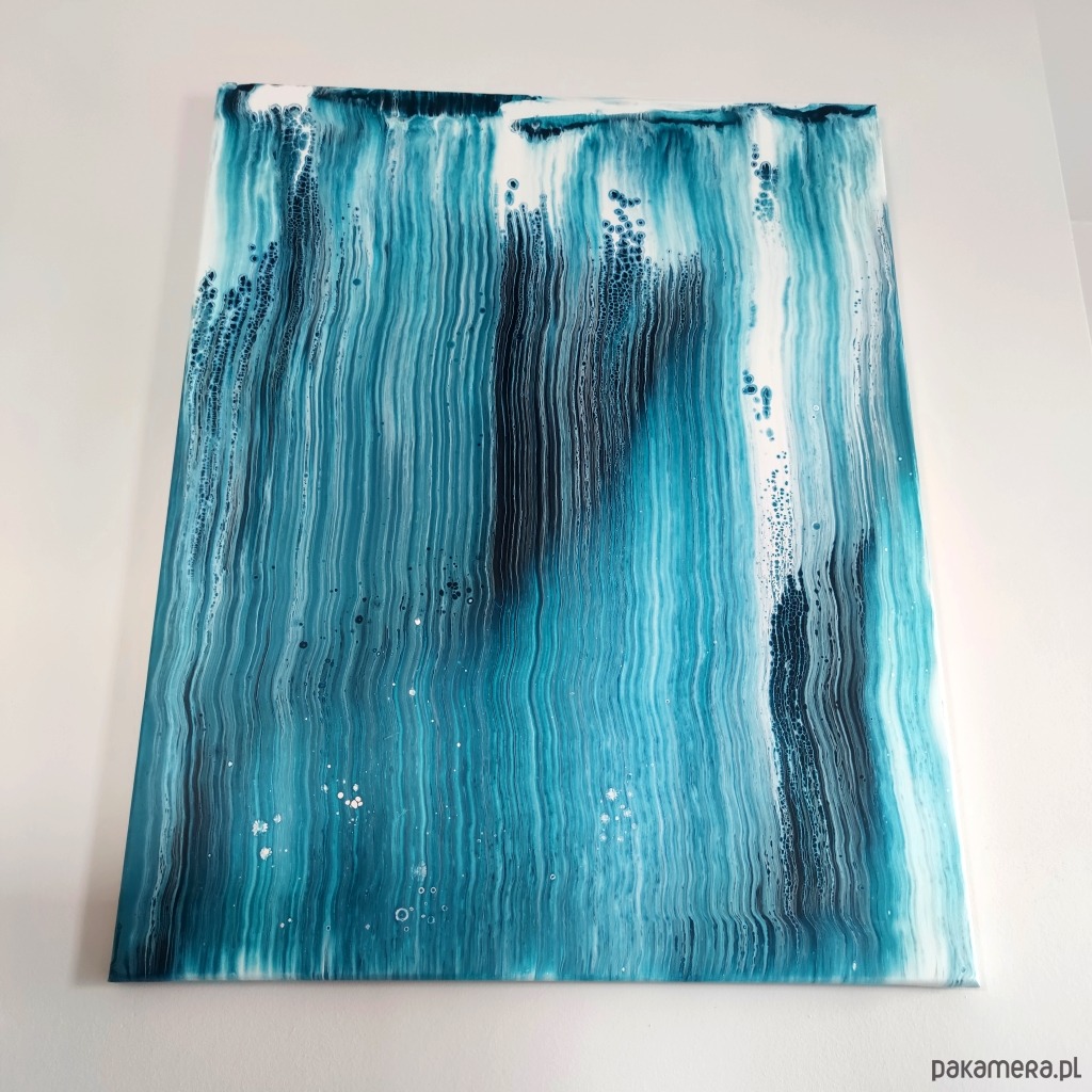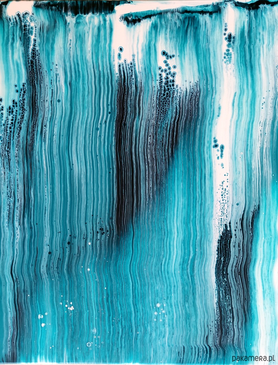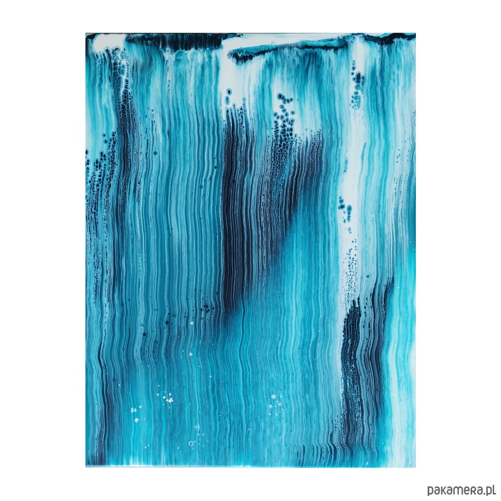 ICEBREAKER. Obraz abstrakcyjny malowany farbami akrylowymi na dobrej jakości podobraziu bawełnianym produkcji polskiej. Wykorzystałam zieleń ultramaryna i granat marynarski w połączeniu z bielą. Zastosowałam tutaj technikę pouringu, czyli wylewania obrazów i łączenia farb kiedy mają jeszcze płynną konsystenję. Wspaniały detal!
