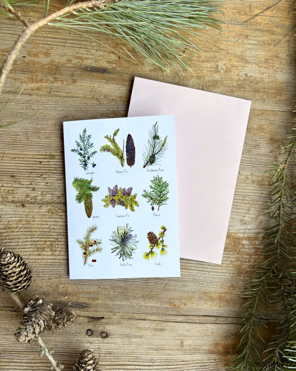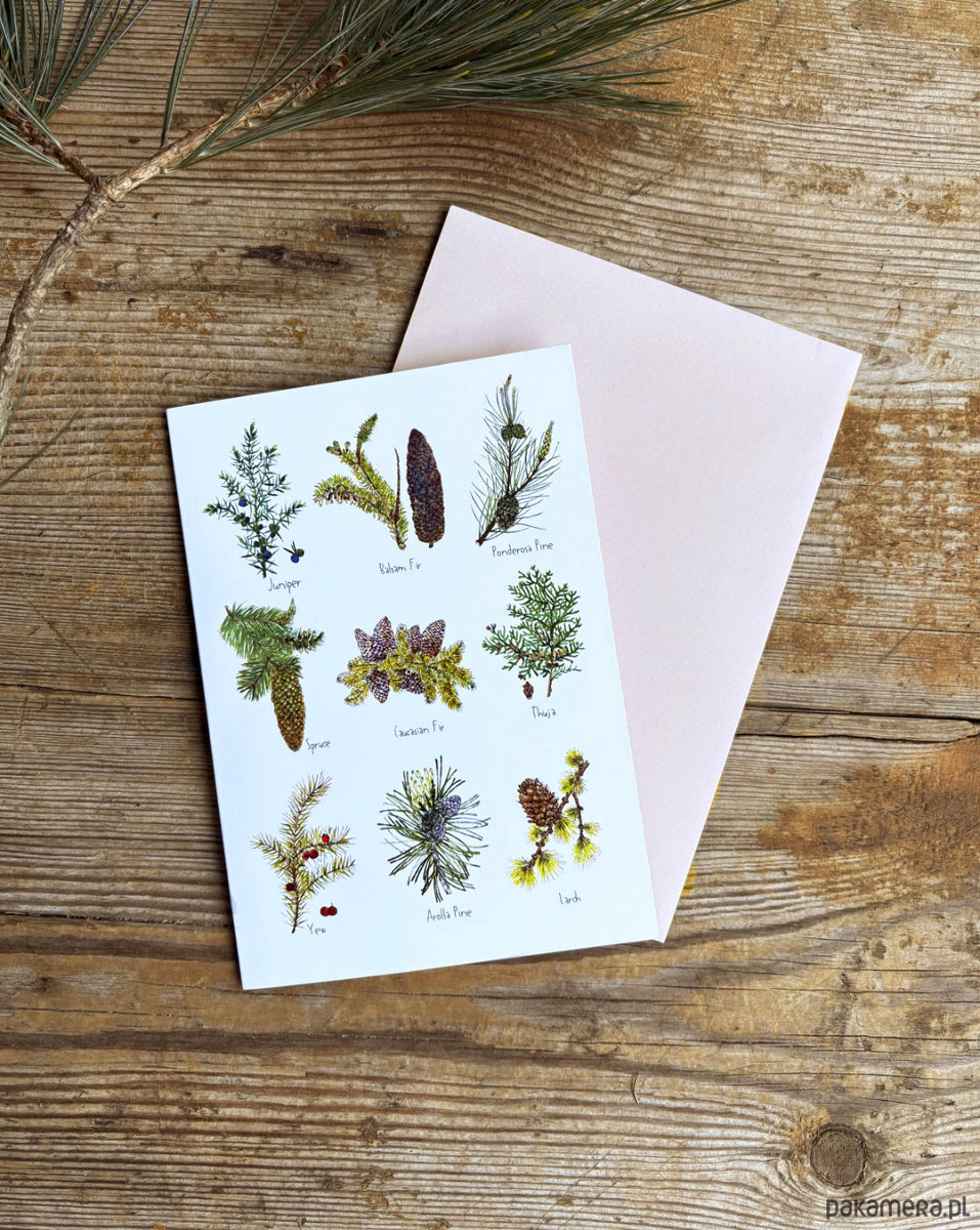 Selekcja iglaków jako wydruk autorskiej ilustracji inspirowanej lasem oraz dawnymi rycinami botanicznymi.