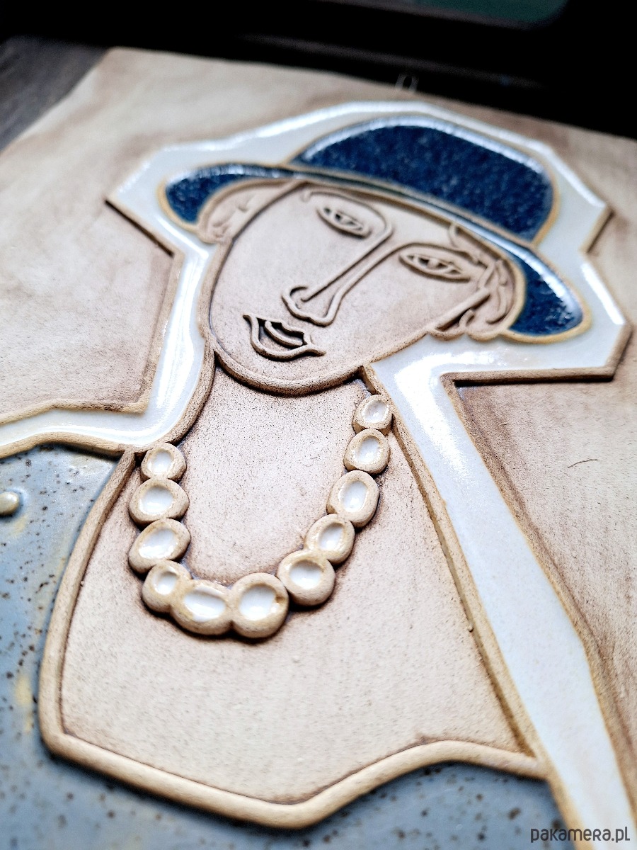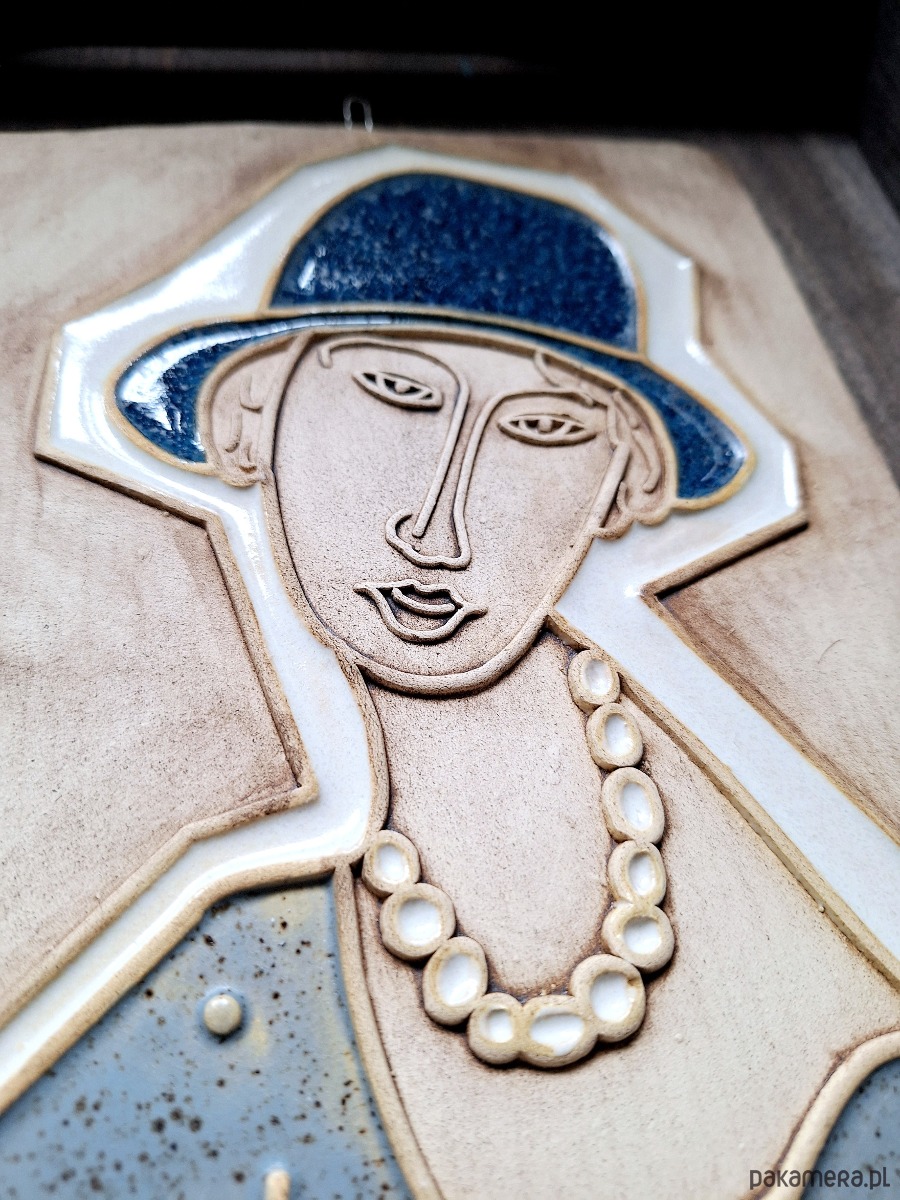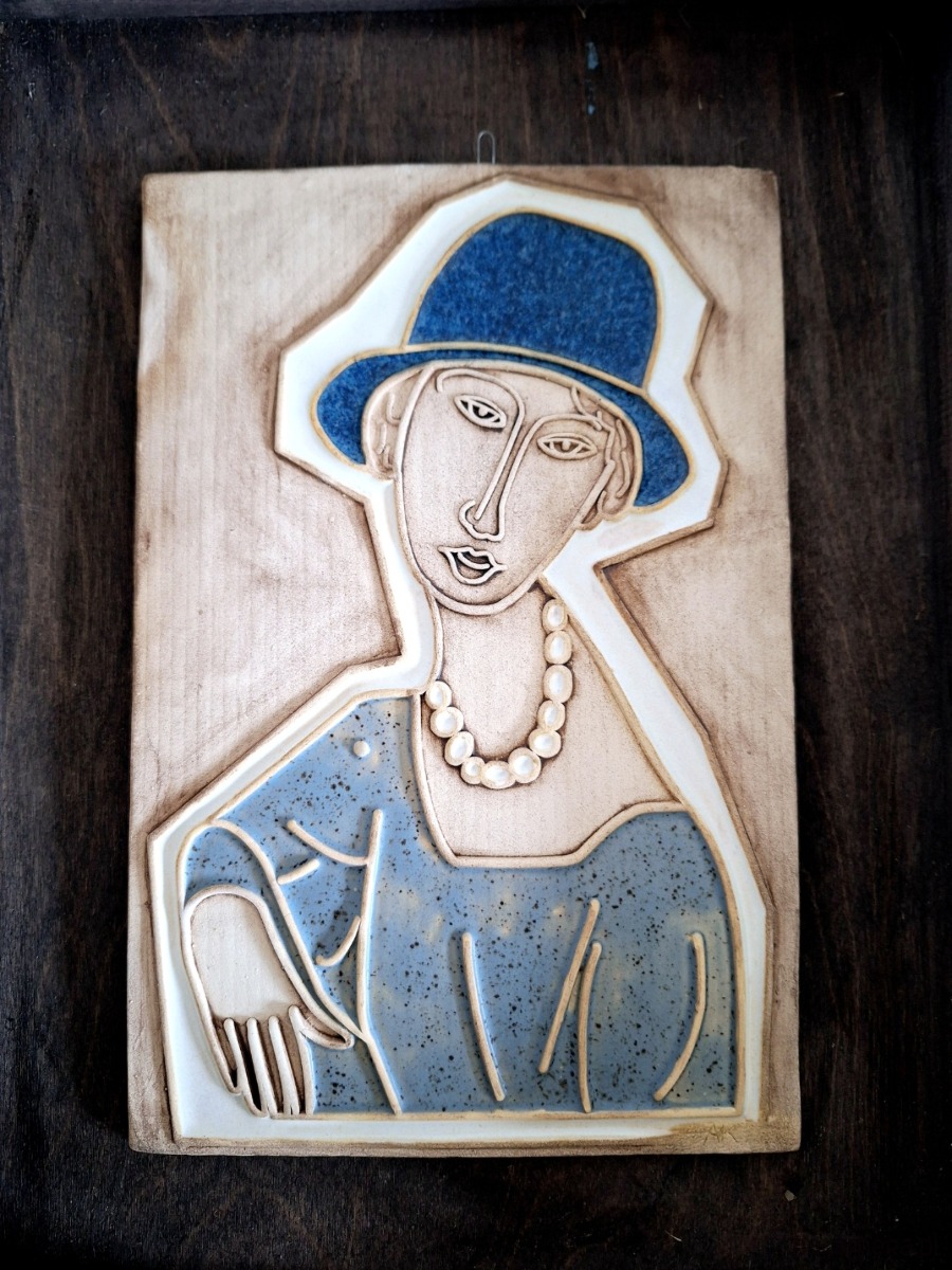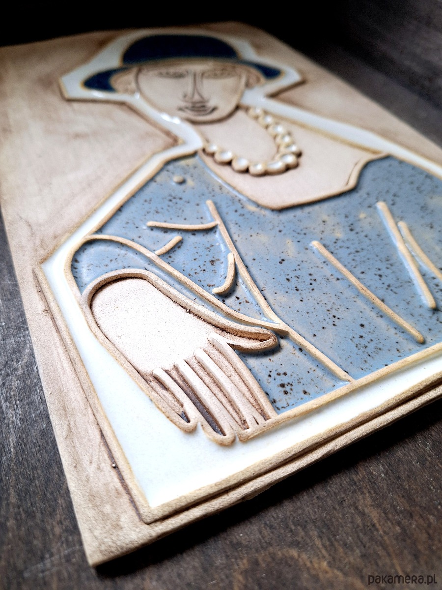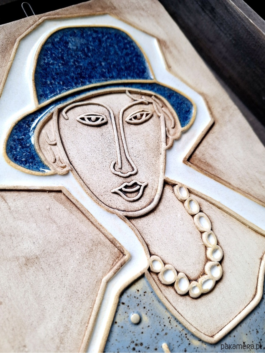 Ceramiczna płaskorzeźba z motywem kobiety w kapeluszu. Dekoracja ręcznie tłoczona i szkliwiona. Dekor w błyszczących kolorach beżu, niebieskim i bieli, z matowym wykończeniem tła. Posiada metalowy haczyk, który umożliwia powieszenie na ścianie.
