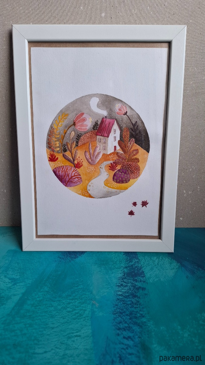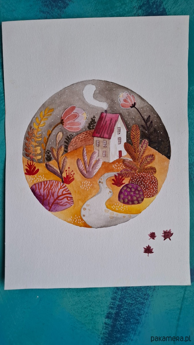 Jesienna magiczna ilustracja w kole, namalowana farbami akwarelowymi na papierze 300g/m2