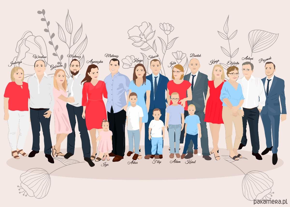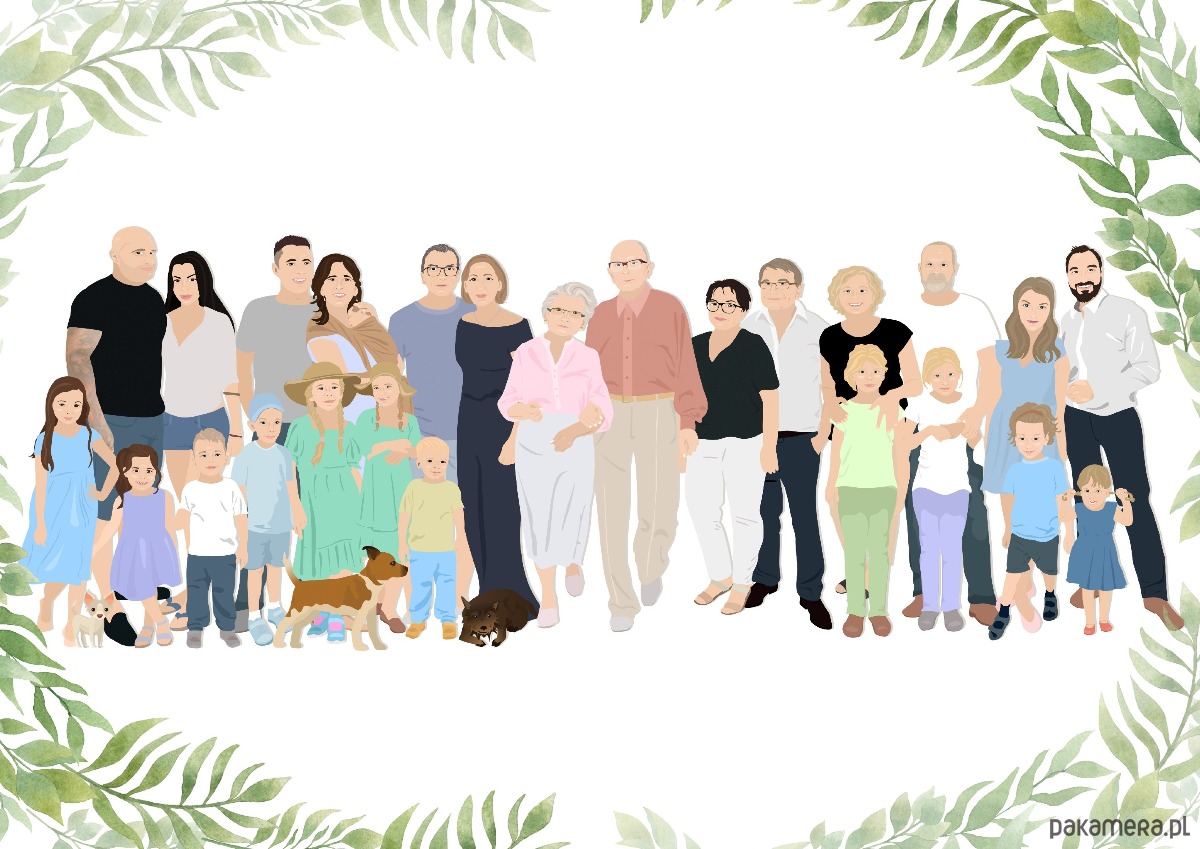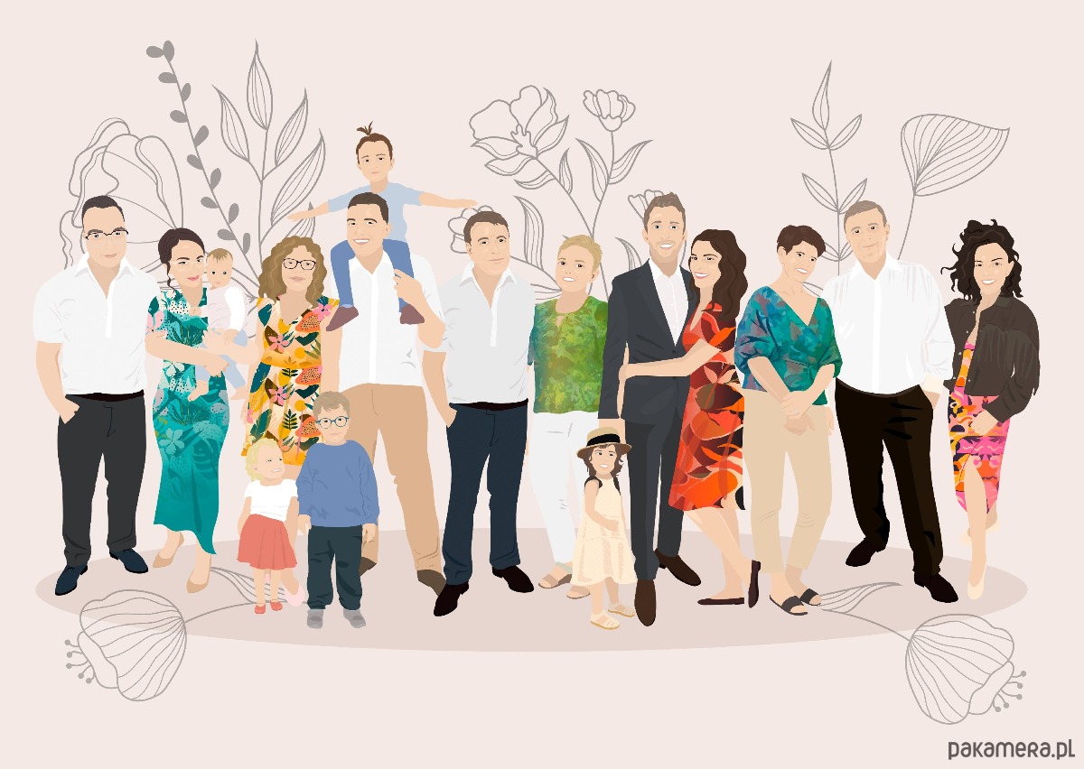 Wystarczy, że prześlesz zdjęcie ludzi (na ilustracji mogę umieścić również Twoje ukochane zwierzę). Potrzebuję również krótkiego opisu postaci, które mam narysować. Jaki mają mieć kolor włosów, w co mają być ubrane, jakie mają trzymać w rękach rekwizyty, jakie mają przybrać pozy itp.