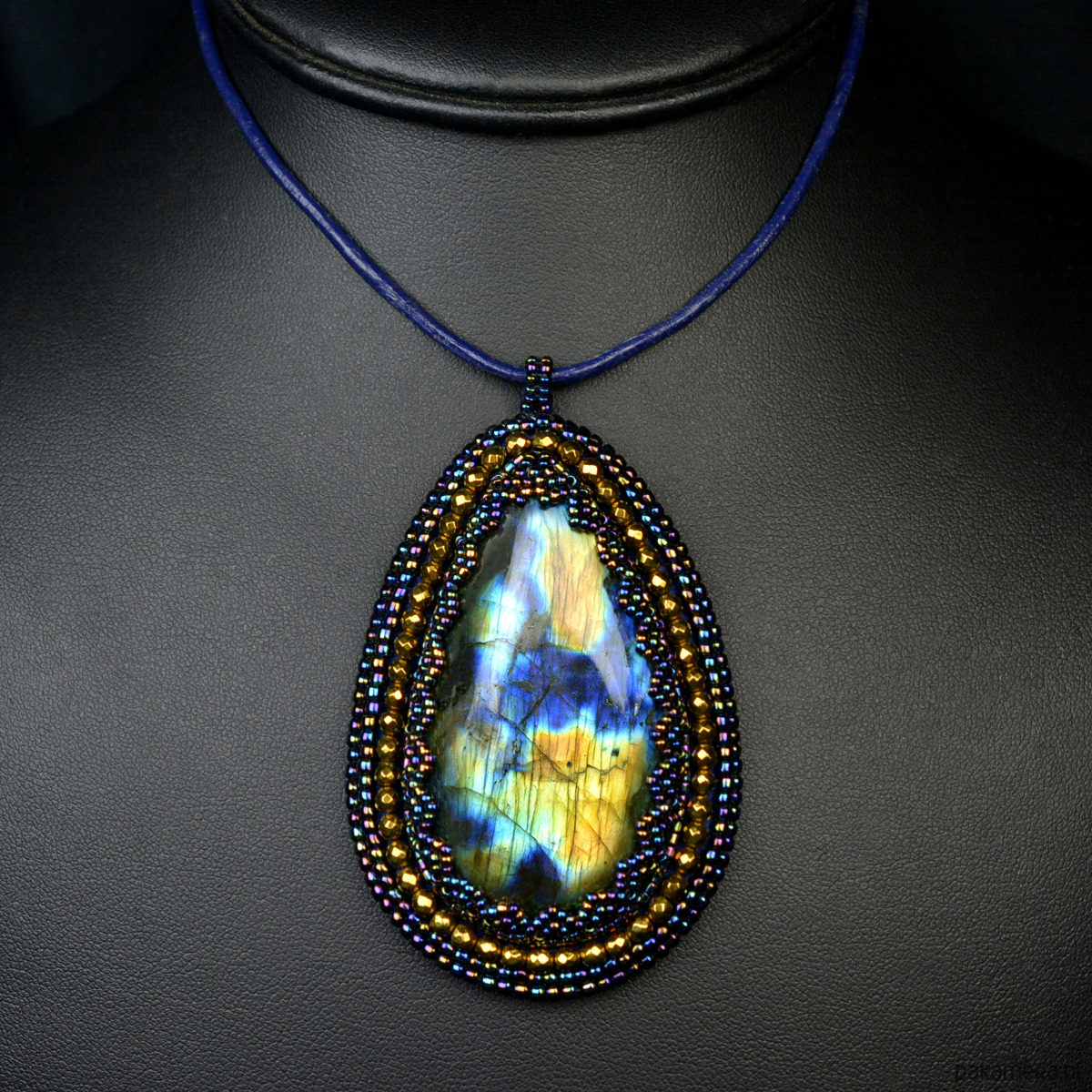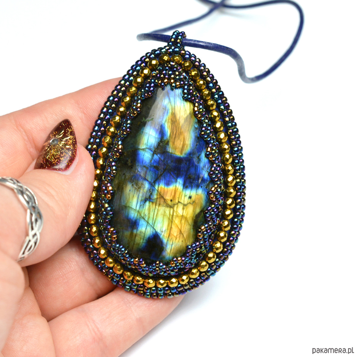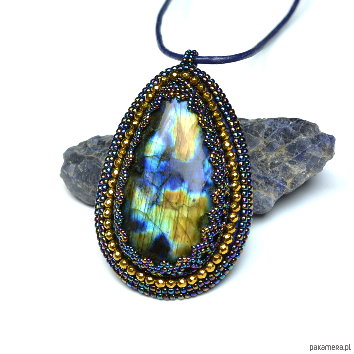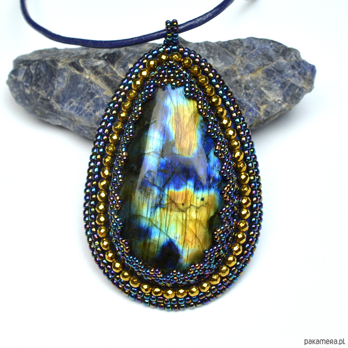 Wykonany niezwykle czasochłonną techniką haftu koralikowego. Jego serce stanowi okazały kaboszon labradorytu o mocnym wielokolorowym ogniu przywodzącym na myśl przestrzeń kosmiczną. Zdjęcia nie są w stanie oddać jego urody.