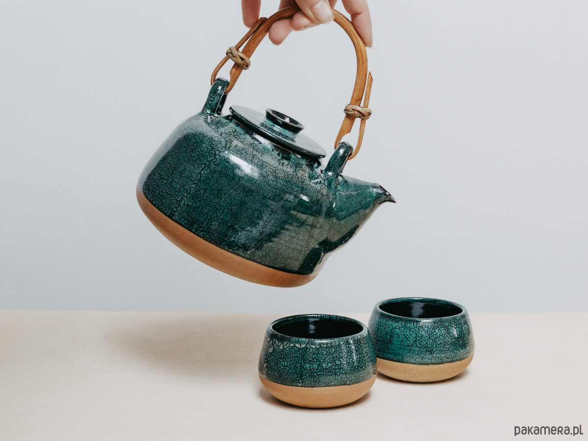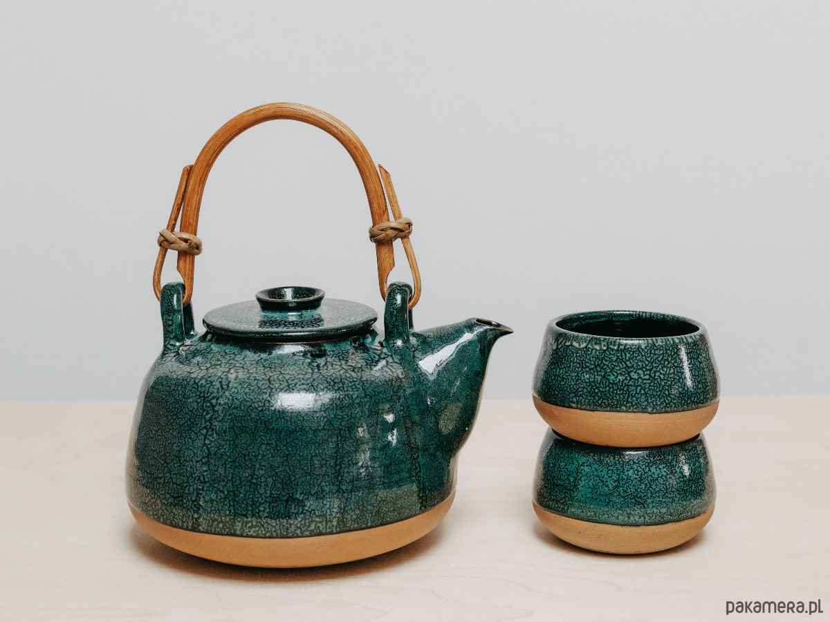 Imbryk z dwoma czarkami - idealny towarzysz do zaparzania popołudniowej herbatki.