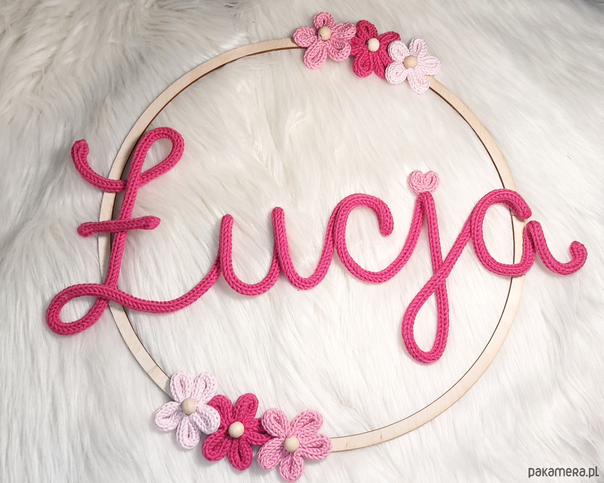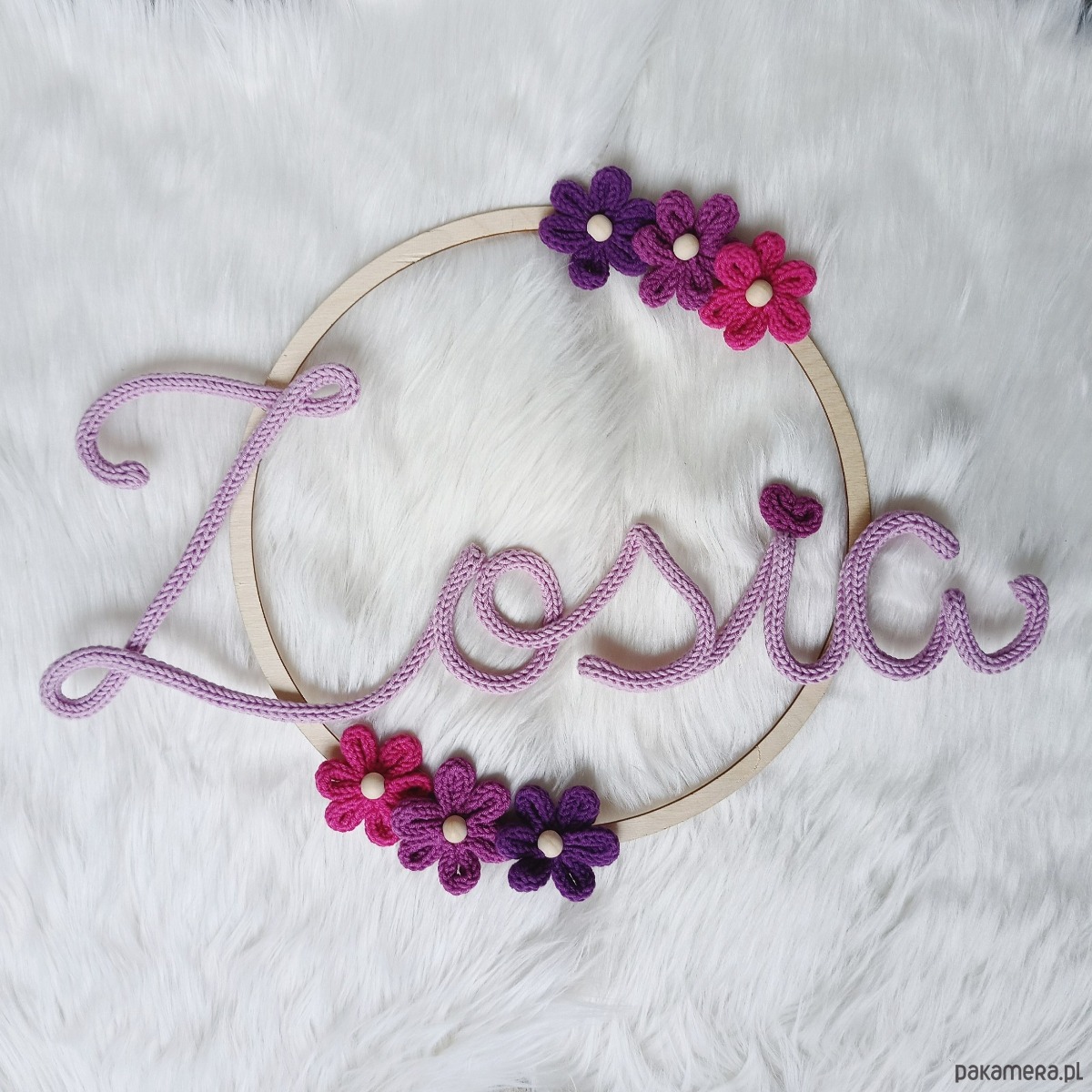 Włóczkopisowe imię w jeszcze bardziej ozdobnej wersji na kole z ozdobnymi kwiatkami