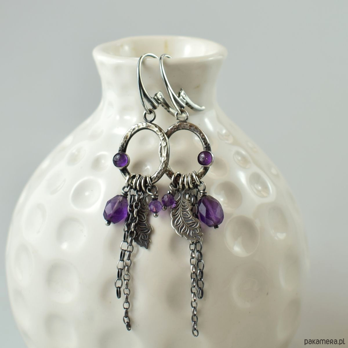 Kolczyki z kolekcji Imperfect, wykonane w całości ze srebra z ametystem. Biżuteria została przyciemniona (oksydowanie) a następnie wypolerowana. Długość całkowita kolczyka 7,5 cm. Biżuteria zostanie ozdobnie zapakowana.