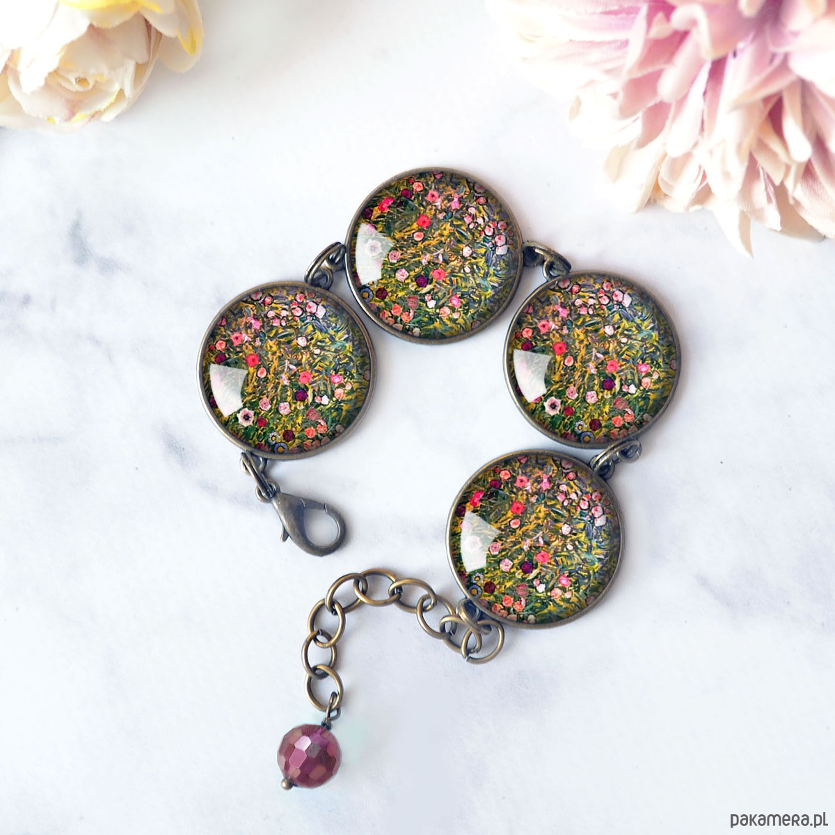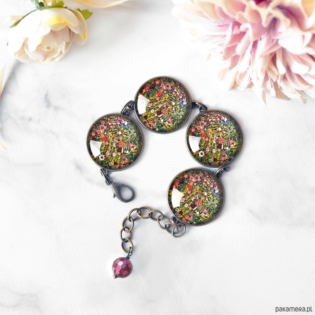Bardzo efektowna bransoletka z oryginalną grafiką artystyczną, zatopioną pod wypukłym szkłem, dającym efekt 3D, w oprawie w kolorze antycznego brązu.