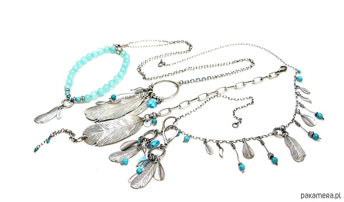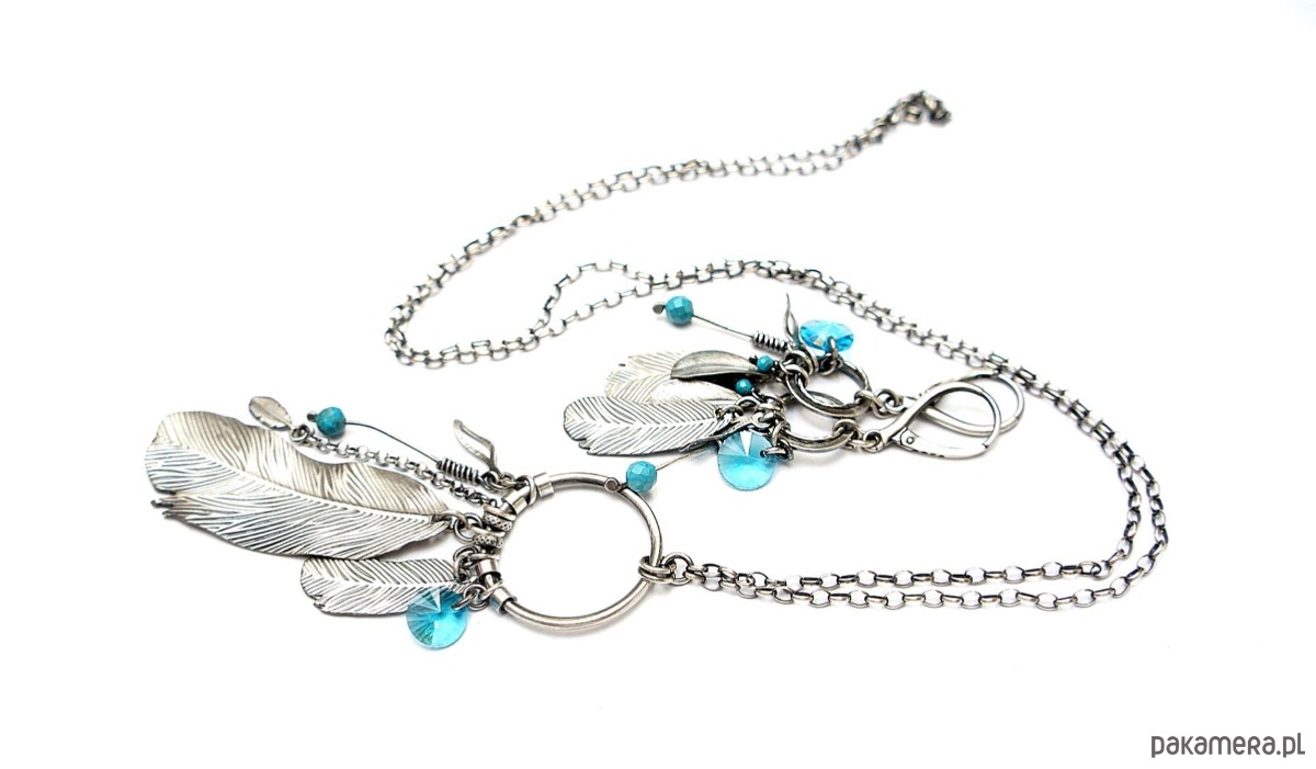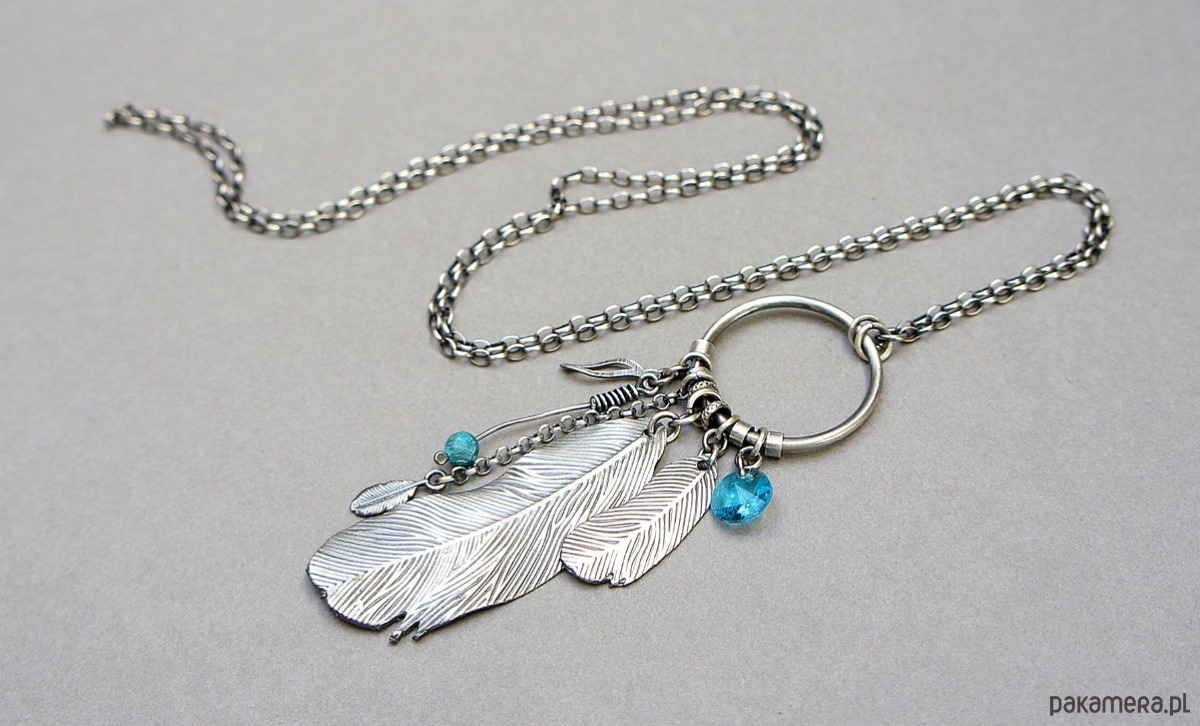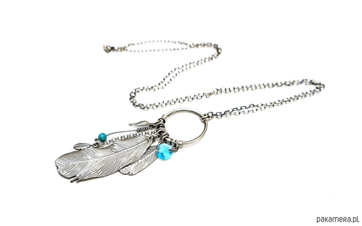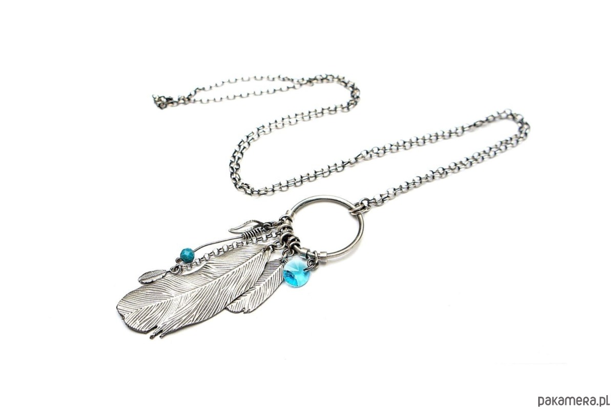 Naszyjnik wykonany ze srebra pr. 925 w połączeniu z fasetowaną kuleczką magnezytu [4mm], kryształkiem [8mm] oraz srebrnymi piórkami [48mm i 25mm]. Średnica koła [24mm]. Srebro oksydowane i przetarte. Całkowita długość naszyjnika 69cm. Biżuteria ozdobnie zapakowana.