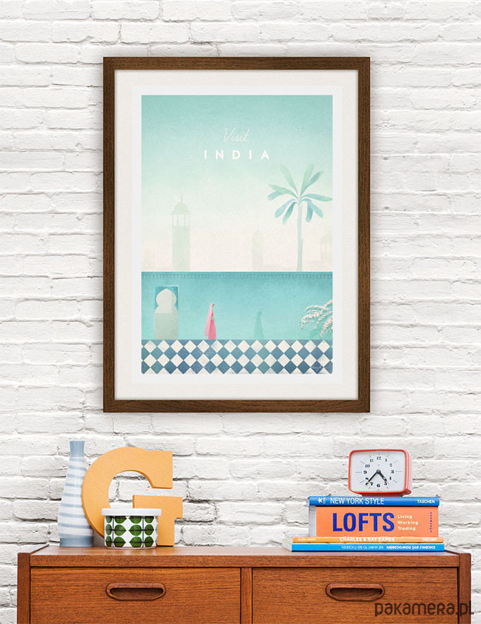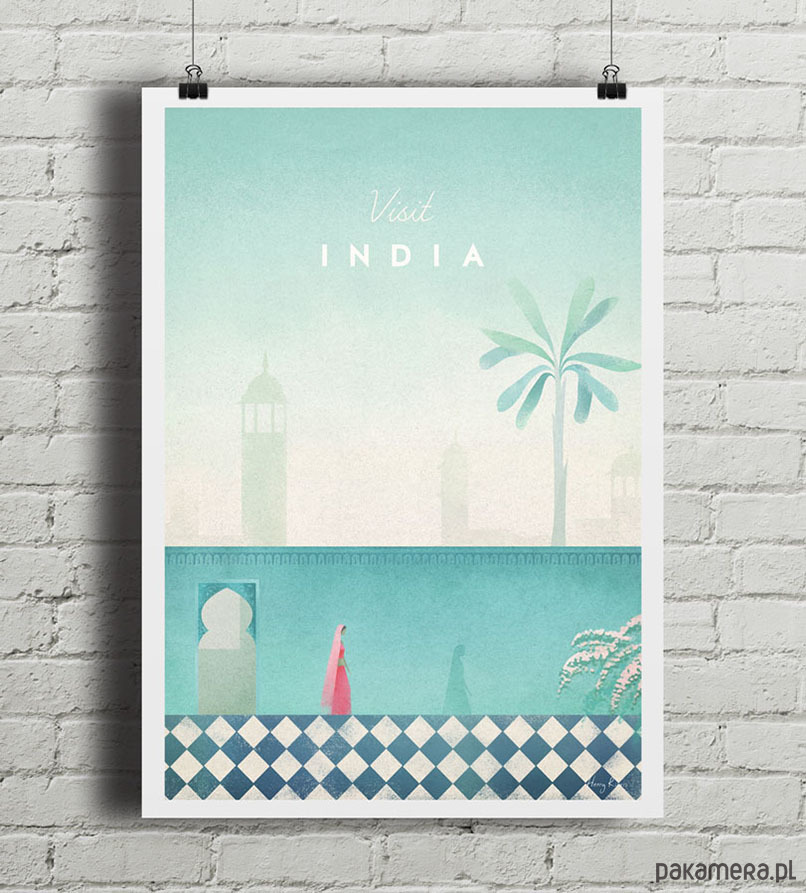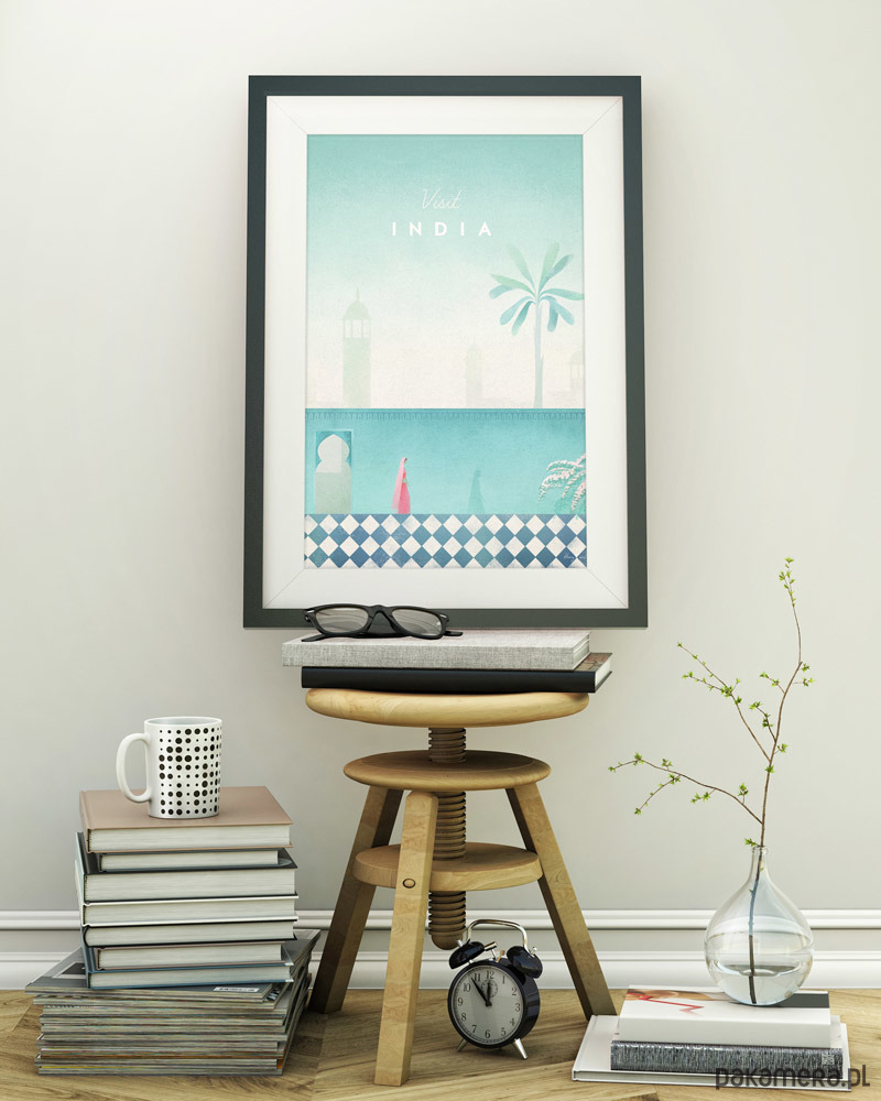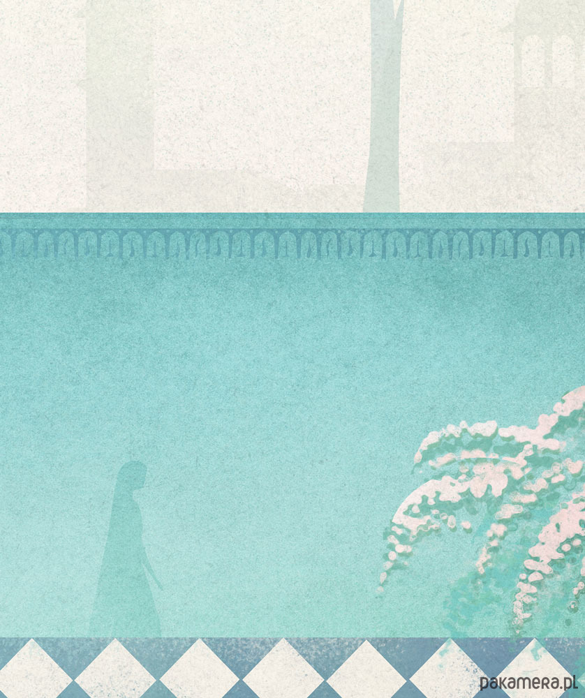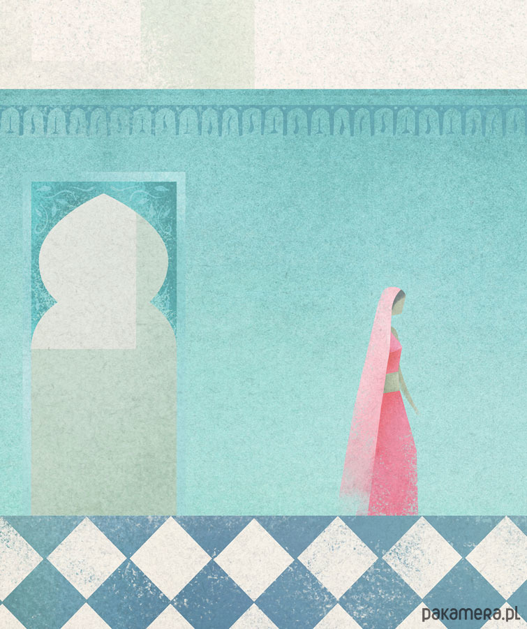 Autorski plakat w stylu vintage przedstawiający kobietę spacerującą po dziedzińcu. Inspiracją dla sceny była ozdobna indyjska architektura, bujna roślinność, ciepłe światło i bogata kolorystyka. Inspirowany plakatami podróżniczymi z lat 20-tych XX wieku.